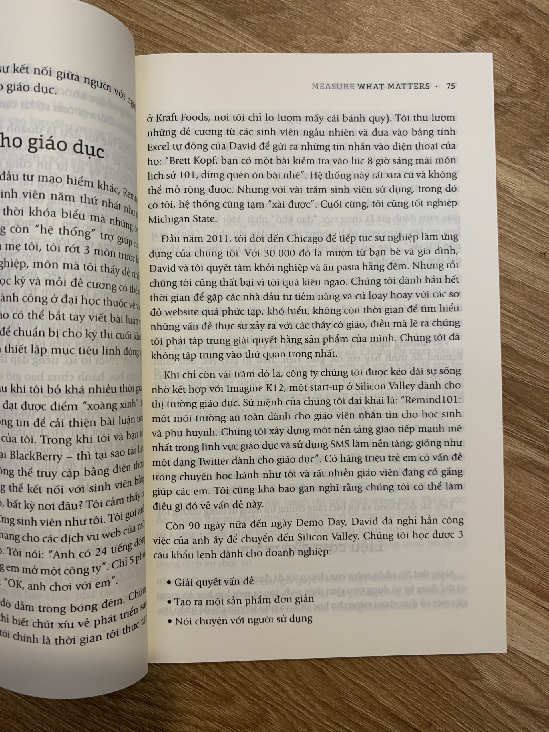 Quyển sách là tập hợp các câu chuyện có thật được chính những nhà sáng lập của Google, Nuna, MyFitnessPal, Remind, Gates Foundation, Ford, Wells Fargo,… kể lại. Có người thành công và cũng không thiếu người thất bại. Nhưng điểm chung là chúng đều để lại những bài học kinh nghiệm cho các nhà lãnh đạo khi muốn áp dụng OKRs.