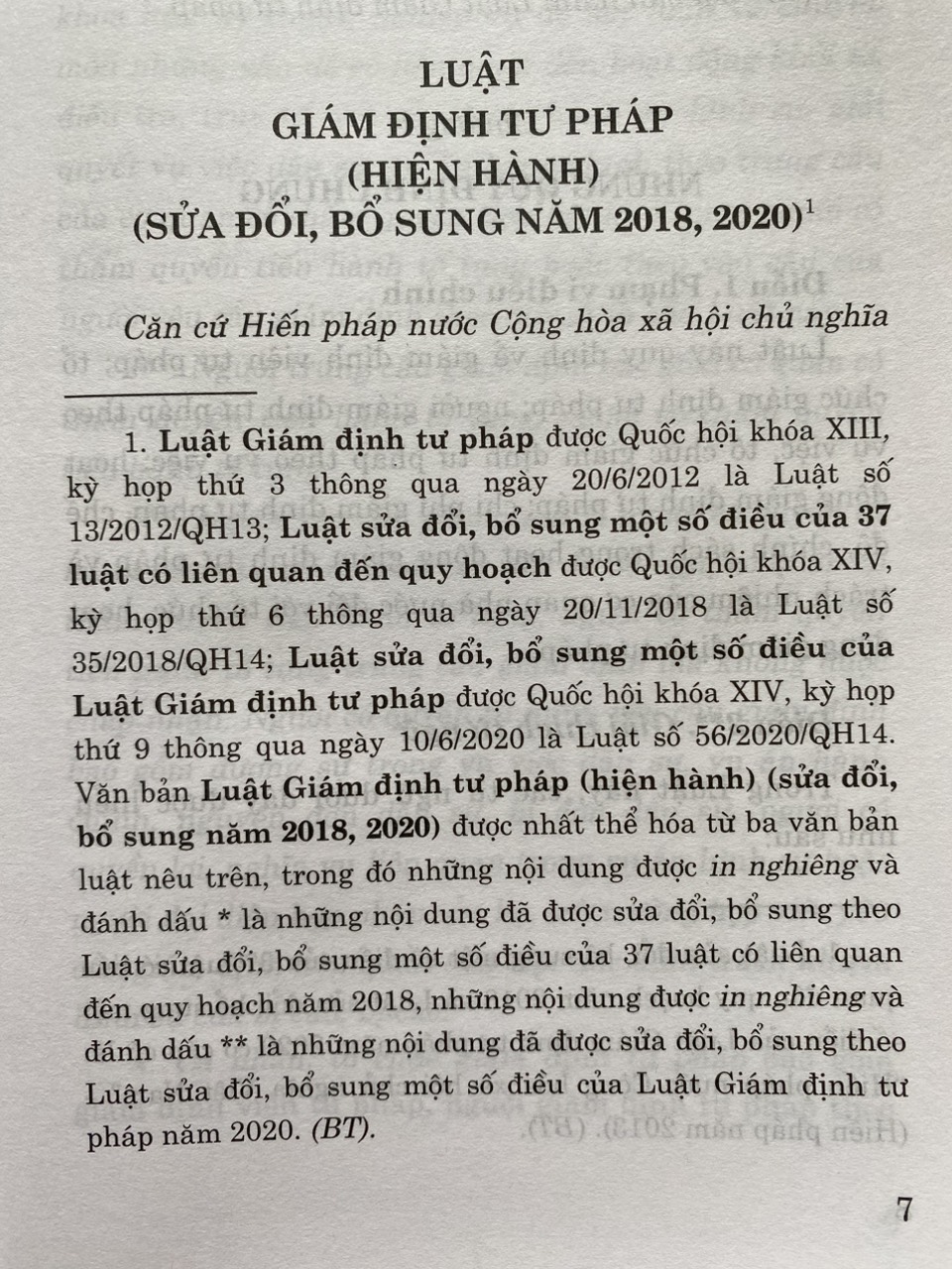 Luật Giám định tư pháp (hiện hành) (sửa đổi, bổ sung năm 2018, 2020) gồm 7 chương, 46 điều, quy định về: giám định viên tư pháp; tổ chức giám định tư pháp; người giám định tư pháp theo vụ việc, tổ chức giám định tư pháp theo vụ việc; hoạt động giám định tư pháp; chi phí giám định tư pháp, chế độ, chính sách trong hoạt động giám định tư pháp và trách nhiệm của cơ quan nhà nước đối với tổ chức, hoạt động giám định tư pháp. Luật Giám định tư pháp được Quốc hội khóa XIII, kỳ họp thứ 3 thông qua ngày 20/6/2012 và được sửa đổi, bổ sung vào các năm 2018, 2020. Cuốn sách Luật Giám định tư pháp (hiện hành) (sửa đổi, bổ sung năm 2018, 2020) là văn bản luật hợp nhất của Luật Giám định tư pháp năm 2012 và các nội dung của hai lần sửa đổi tạo thành một văn bản Luật Giám định tư pháp thống nhất hiện hành và mới nhất thuận tiện trong sử dụng tra cứu tham khảo.