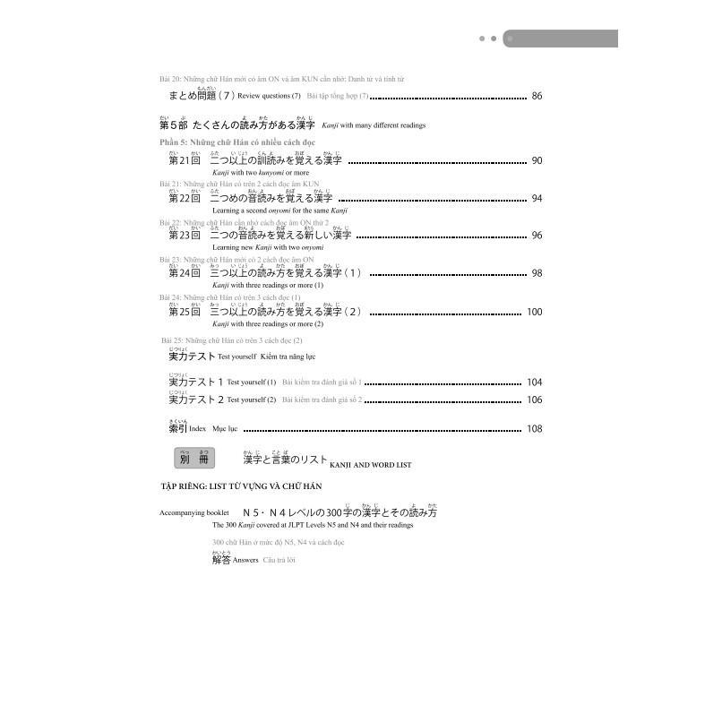 Tài liệu luyện thi năng lực tiếng Nhật N3- Kanji là quyển sách dành cho đối tượng người học đã kết thúc quá trình học N4 với khoảng 300 chữ Hán và đang bước vào giai đoạn trung cấp. Với 25 bài, quyển sách này tập trung vào 354 chữ Hán của mức độ N3.