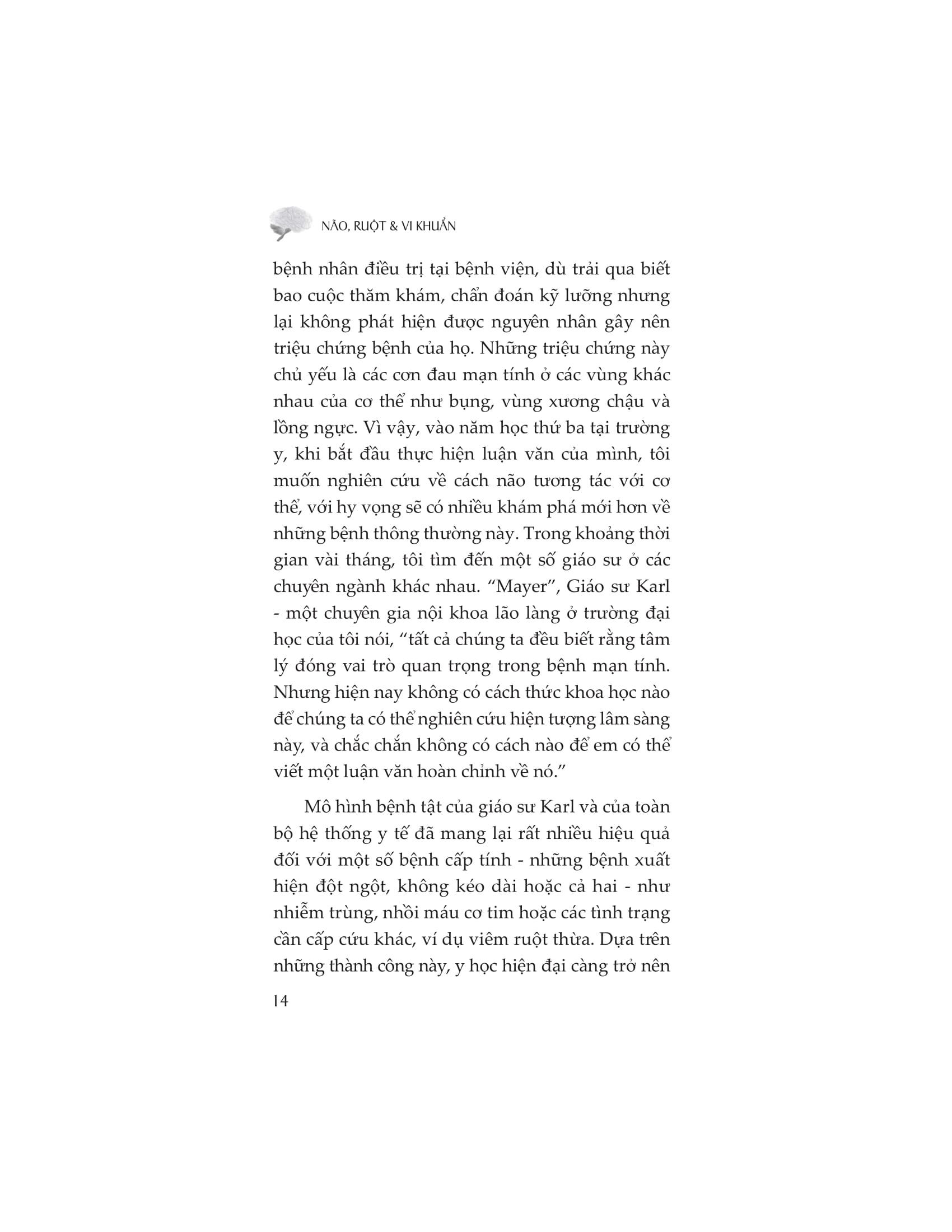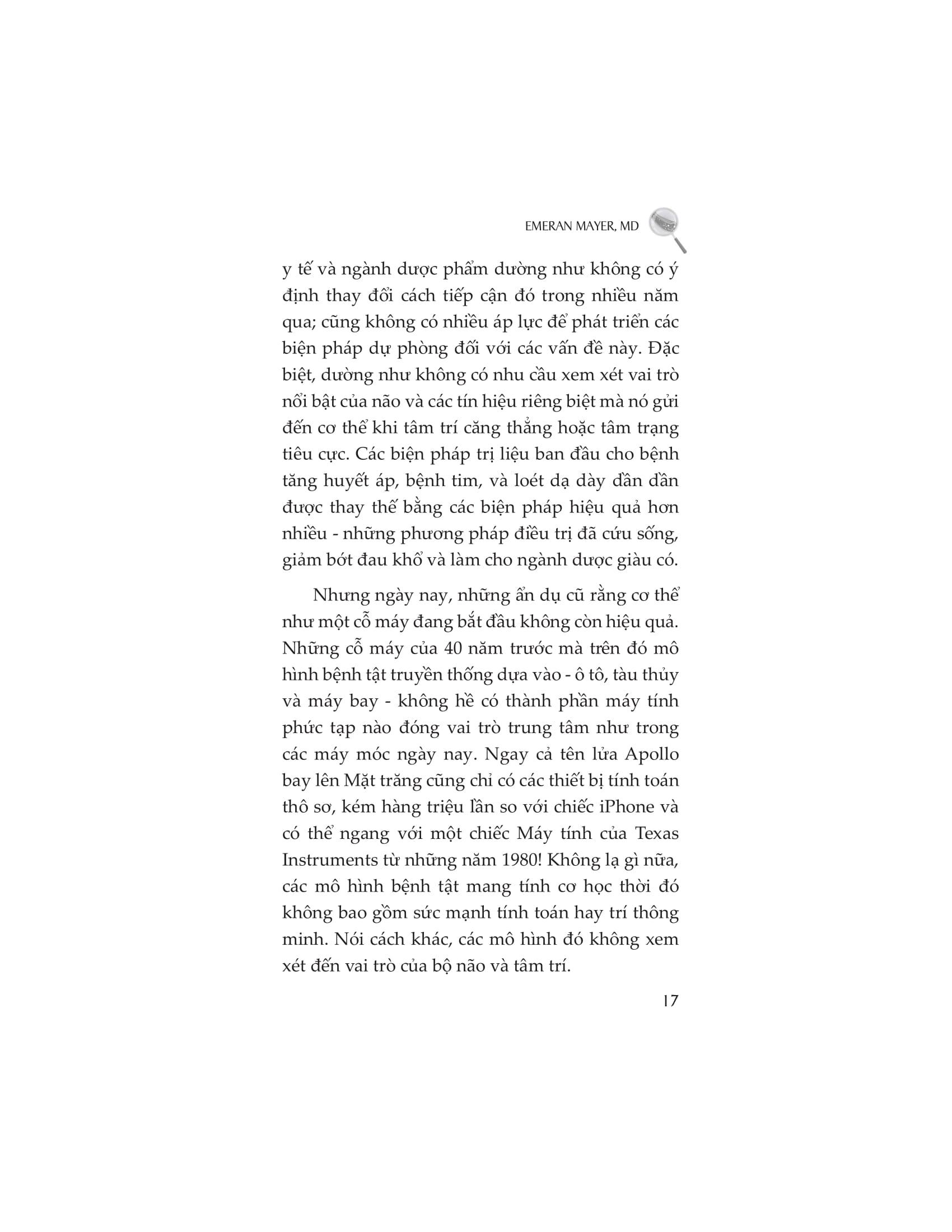 Emeran Mayer, MD làgiám đốc điều hành của Trung tâm Căng thẳng và Khả năng phục hồi Oppenheime và là đồng giám đốc của Trung tâm Nghiên cứu Bệnh Tiêu hóa tại Đại học California ở Los Angeles. Ông được coi là người lãnh đạo tiên phong trên toàn thế giới trong lĩnh vực tương tác hệ vi sinh-não-ruột và tình trạng đau nội tạng mạn tính.Các công trình nghiên cứu của ông đã được công bố trên tạp chí Atlantic, Scientifc American, New York Times, Guardian…