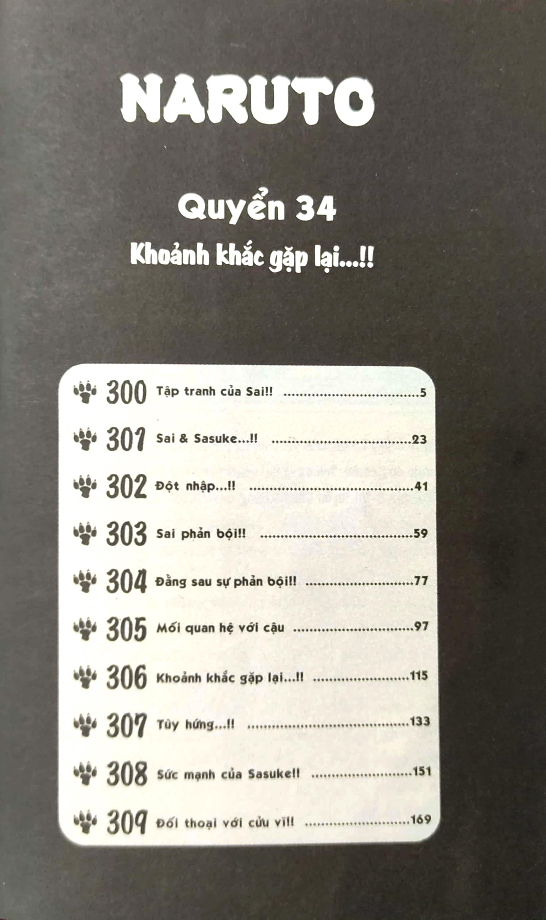 Mua tại TiktokNaruto - Tập 34 - Khoảnh Khắc Gặp Lại...!! Thẳng tiến đến hang ổ của Orochimaru! Sau khi thâm nhập, đội Naruto đã gặp lại Sai. Nhờ tấm lòng luôn muốn gắn kết với Sasuke, Naruto đã giúp Sai tìm lại được cảm xúc của bản thân. 2 năm rưỡi vụt qua, cuối cùng thời khắc tái ngộ giữa 2 người bạn cũng tới…!! MASASHI KISHIMOTO “Dạo gần đây, xung quanh tôi ai cũng bảo họ đang đọc sách. Vì rất hiếm khi đọc sách nên tôi cũng tính kiếm gì đó đọc thử. Có lẽ là tôi sẽ tìm đọc thể loại truyện giả tưởng hoặc tiểu thuyết của Jump xem sao.”