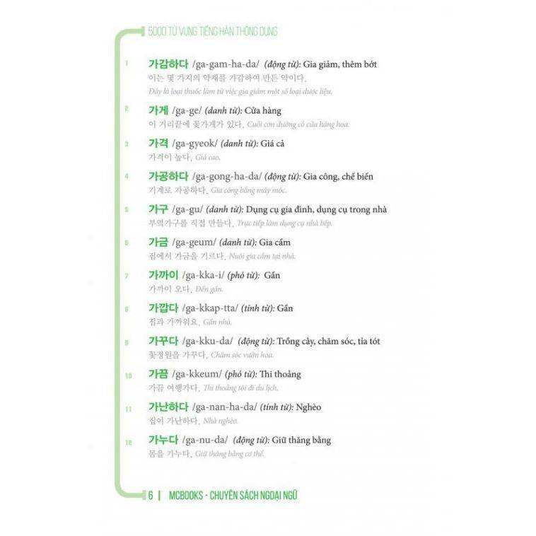 - 5000 Từ Vựng Tiếng Hàn Thông Dụng Công ty phát hành MCBOOKS Tác giả The Changmi, GJin Nhà xuất bản Hồng Đức Năm xuất bản 2020 Số trang 450 GIới thiệu sách Trong quá trình học ngôn ngữ, bên cạnh ngữ pháp thì từ vựng đóng vai trò quan trọng. Chúng ta đều biết, từ vựng là vốn từ, kho từ của ngôn ngữ đó. Hầu hết, khi bạn trang bị cho mình được khối lượng từ vựng đủ lớn thì quá trình giao tiếp sẽ trở nên đơn giản hơn rất nhiều. Vậy nên, mỗi người học cần tạo cho mình một thói quen học tập từ vựng mỗi ngày và cố gắng ghi nhớ bằng cách học phù hợp với bản thân. Cuốn 5000 Từ vựng tiếng Hàn thông dụng giúp bạn tăng vốn từ vựng hàng ngày tự nhiên như hơi thở khi có thể đem nó đi đâu tùy thích, lấy ra tra lúc nào tuỳ ý. Tiện lợi mọi nơi bạn đến trong lúc học, đi chơi hay bất cứ khi nào trên đường đi làm về, trong xe buýt lúc rảnh rang. Thấy trên bảng quảng cáo chỉ dẫn, hay tờ báo đang đọc gặp từ lạ đem cuốn sách ra tra. Sau đó tận dụng học hiểu phát âm, cách sử dụng một từ mới. Như thế thường xuyên bạn đã xây dựng cho mình một kho từ vựng khổng lồ dễ dàng. Dưới sự nghiên cứu, tìm tòi và tham khảo rất nhiều nguồn để có thể hệ thống cho bạn đọc được 5000 từ vựng thường sử dụng trong giao tiếp tiếng Hàn quả là không đơn giản chút nào. Tuy nhiên, những từ vựng được lựa chọn đều có căn cứ rất rõ ràng. Hệ thống từ vựng sắp xếp khoa học và logic Hệ thống từ vựng trong cuốn sách đều đã được biến hóa sắp xếp theo alphabet, nội dung hợp lý, trình bày logic. Dễ tìm, dễ nhớ, dễ ứng dụng vào học tập, cuộc sống. Hơn nữa sự sinh động các hình ảnh màu sắc bắt mắt còn kích thích người học, nhắc nhở bạn chủ động học tìm tòi ngay khi cầm trên tay cuốn sách.