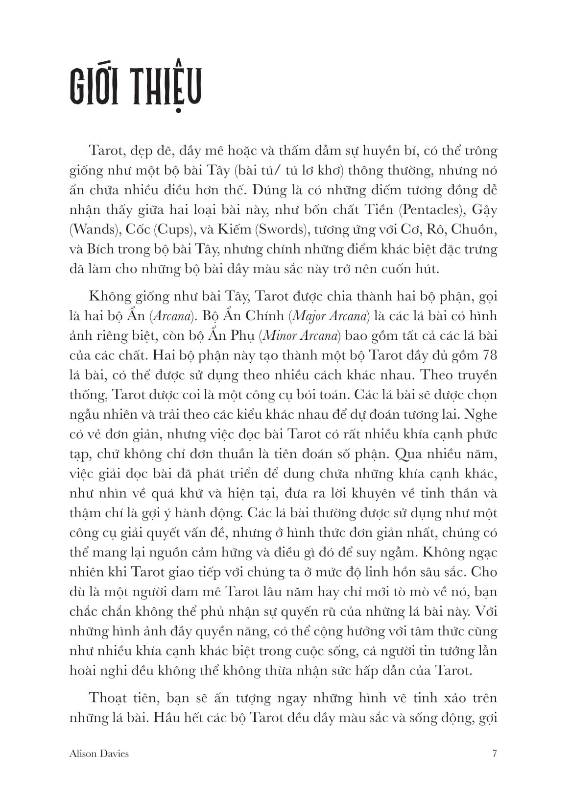 Tarot không đơn giản chỉ là những lá bài đầy màu sắc; đó là một vũ trụ huyền bí, mê hoặc và ẩn chứa nhiều thông điệp sâu sắc. Mỗi lá bài đều có một câu chuyện riêng, những biểu tượng tâm linh kết hợp với nhau một cách tài tình, trở thành một công cụ tuyệt vời để bạn khám phá câu chuyện của một ai đó hoặc của chính m.ình. Những câu chuyện bí ẩn sau lá bài Tarot của tác giả - chuyên gia kể chuyện Alison Davies sẽ dẫn dắt bạn bước vào hành trình Tarot màu nhiệm ấy, hướng dẫn bạn kết nối với các hình ảnh của từng lá bài trong bộ bài Rider-Waite Smith, để hiểu sâu – nắm chắc – cảm nhận được trọn vẹn nhất một bộ bài Tarot.