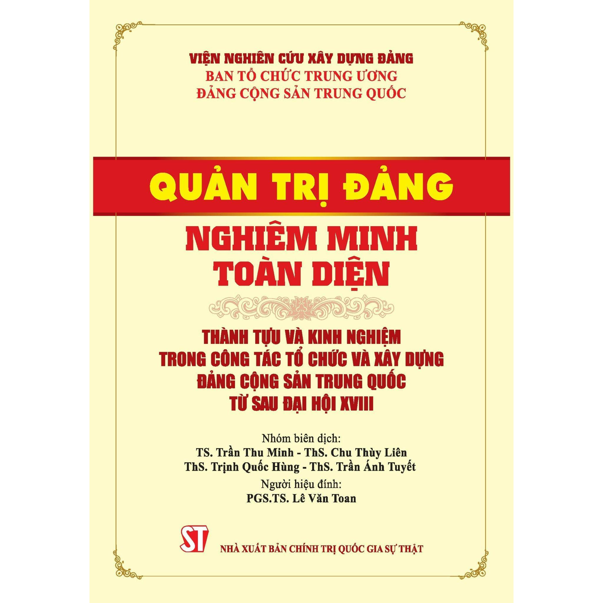 Cuốn sách Quản trị Đảng nghiêm minh toàn diện - Thành tựu và kinh nghiệm trong công tác tổ chức và xây dựng Đảng Cộng sản Trung Quốc từ sau Đại hội XVIII là sách dịch Trung - Việt. Là công trình nghiên cứu và tổng kết toàn diện về cơ sở lý luận, sự hình thành, xác lập, cho tới thực trạng cũng như những thành tựu, bài học kinh nghiệm trong công tác tổ chức, xây dựng Đảng nghiêm minh toàn diện của Đảng Cộng sản Trung Quốc, sau Đại hội Đảng lần thứ XVIII. Ba chương sách mở đầu đã nêu ra và phân tích có hệ thống cơ sở lý luận và thực tế, sự xác lập và hình thành chiến lược quản trị Đảng nghiêm minh toàn diện, vai trò hạt nhân của Tổng Bí thư Tập Cận Bình, tư tưởng Tập Cận Bình về “chủ nghĩa xã hội đặc sắc Trung Quốc thời đại mới”. Chín chương sách tiếp theo phân tích rõ thực trạng, những thành tựu đạt được cùng những bài học kinh nghiệm rút ra trong quản trị Đảng nghiêm minh toàn diện; được thể hiện cụ thể và lần lượt ở các lĩnh vực về: xây dựng chính trị trong Đảng, bảo vệ tư tưởng của Đảng, xây dựng đội ngũ cán bộ của Đảng, xây dựng tổ chức cơ sở của Đảng, công tác nhân tài của Đảng, xây dựng tác phong của Đảng, xây dựng kỷ luật của Đảng, kinh nghiệm đấu tranh chống tham nhũng, xây dựng chế độ trong Đảng và việc thực hiện trách nhiệm quản trị Đảng…