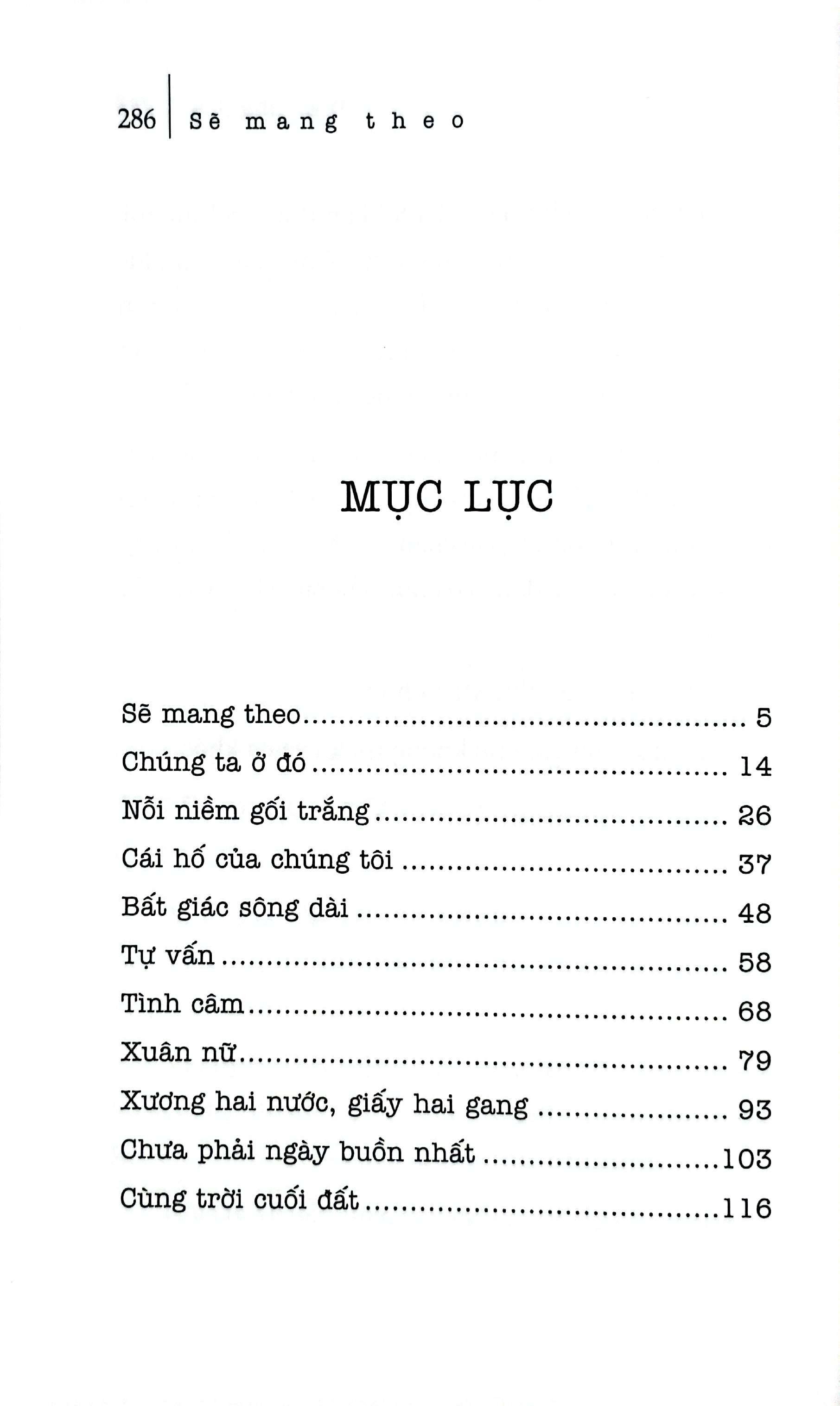Đây là tinh tuyển với con số 21 trong tổng số hàng trăm truyện đã viết mấy chục năm qua. “Sẽ mang theo” là truyện viết 2020, cuối cùng, cái duyên thời gian ngẫu nhiên khi tôi đinh ninh sẽ không viết truyện ngắn nữa. Tôi mãn nguyện với việc chọn này và mời gọi bạn đọc và rằng, rằng nhất định tôi cũng sẽ mang theo – niềm vui nỗi buồn và vinh hạnh của một đời viết.” (Dạ Ngân)