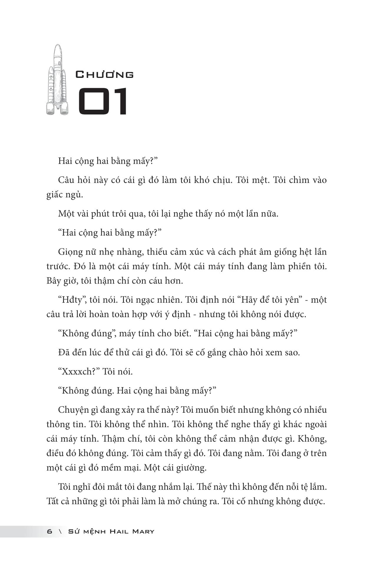 - Top 100 cuốn sách hay nhất thế kỷ 21 do độc giả New York Times bình chọn Một sứ mệnh tuyệt vọng. Một phi hành gia đơn độc. Và cơ hội cuối cùng để cứu lấy Trái Đất. Ryland Grace thức dậy trong một con tàu vũ trụ tối tân, trôi dạt giữa không gian, cách xa Trái Đất hàng triệu dặm ánh sáng. Không ký ức, không đồng đội, chỉ có hai thi thể lạnh lẽo bên cạnh. Anh không biết m.ình là ai, đang ở đâu, hay tại sao lại là người sống sót cuối cùng. Những mảnh ký ức rời rạc dần trở lại – cùng với một sự thật kinh hoàng: anh là niềm hy vọng cuối cùng của nhân loại. Một chủng vi sinh vật ngoài hành tinh đang hút năng lượng từ Mặt Trời và làm chậm quá trình phát sáng của nó, đẩy Trái Đất vào viễn cảnh diệt vong. Nhiệm vụ của Ryland là tìm ra cách ngăn chặn mối đe dọa này. Nhưng anh không phải là sinh vật duy nhất trong vũ trụ thực hiện sứ mệnh đó… Giữa hành trình cô độc, Ryland bất ngờ gặp gỡ một sinh vật thông minh đến từ một hành tinh xa xôi cũng đang gặp hiểm họa tương tự. Không nói cùng ngôn ngữ, không cùng nền văn minh, nhưng họ cùng chung mục tiêu: sống sót, cứu lấy hành tinh của m.ình. Và từ đó, một tình bạn chưa từng có trong lịch sử nhân loại được hình thành. Khi giải pháp cuối cùng đã nằm trong tay, Ryland buộc phải đối mặt với quyết định khó khăn nhất đời m.ình. Trở về Trái Đất với vinh quang – hay ở lại, đơn độc giữa không gian, hy sinh tất cả để cứu lấy bạn m.ình và một thế giới không phải của anh? Sứ Mệnh Hail Mary là một bản giao hưởng giữa khoa học đỉnh cao, trí tưởng tượng táo bạo và thông điệp nhân văn. Hồi hộp, thông minh và đầy cảm xúc, đây là câu chuyện về hy vọng, sự sống còn – và một tình bạn vượt qua mọi giới hạn của không gian và giống loài.