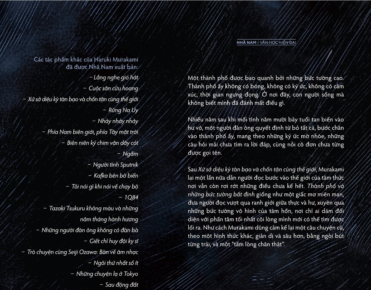 Sau Xứ sở diệu kỳ tàn bạo và chốn tận cùng thế giới, Murakami lại một lần nữa dẫn người đọc bước vào thế giới của tâm thức nơi vẫn còn rơi rớt những điều chưa kể hết. Thành phố và những bức tường bất định giống như một giấc mơ miên man, đưa người đọc vượt qua ranh giới giữa thực và hư, xuyên qua những bức tường vô hình của tâm hồn, nơi chỉ ai dám đối diện với phần tăm tối nhất cõi lòng mình mới có thể tìm được lối ra. Như cách Murakami dũng cảm kể lại một câu chuyện cũ, theo một hình thức khác, giản dị và sâu hơn, bằng ngòi bút từng trải, và một "tấm lòng chân thật