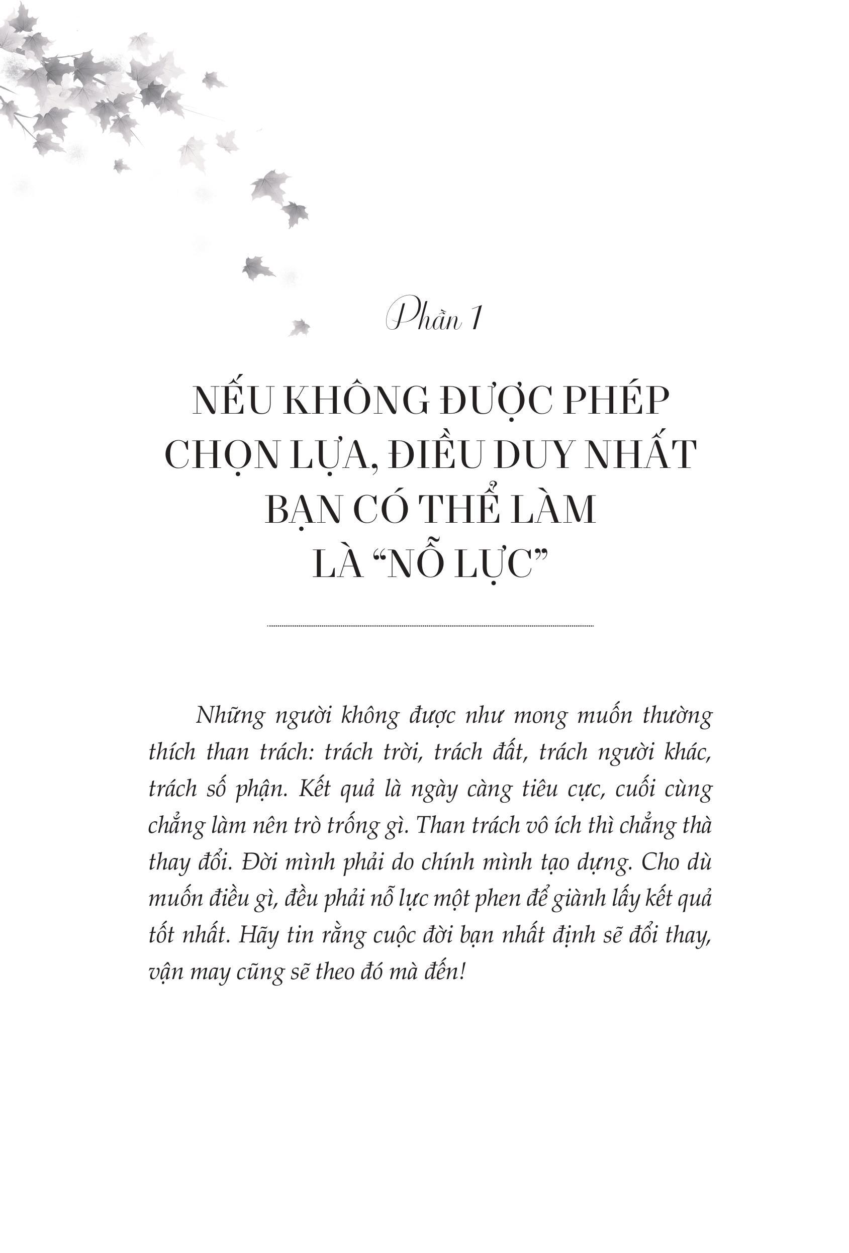 Thế nhưng, nghịch lý cuộc sống của đại đa số chúng ta lại là - oán trách về xuất thân, oán trách cuộc đời bất công, oán trách tài năng không được trọng dụng, nhưng lại chưa bao giờ oán trách bản thân không chịu cố gắng. Không cam tâm chấp nhận hiện thực nhưng lại không chịu thay đổi; không muốn nhẫn nhục chịu đựng nhưng lại không chịu phấn đấu. Chưa kịp phản kháng đã giơ tay đầu hàng, kết cục chỉ có thể là u uất buồn phiền, mang theo vô vàn ai oán tiếp tục khốn đốn. Vì vậy, thay vì oán trách đủ thứ không được như ý ngoài kia, chỉ bằng hãy tìm nguyên nhân ở chính m.ình.