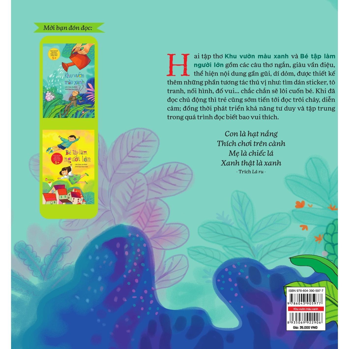 - Bé tập làm người lớn : Mã ISBN: 978-6-390-597-7; Khổ sách: 17x24cm; Số trang: 36 trang; Giá tiền: 35.000đ Thể loại: Thơ thiếu nhi Nhà xuất bản Phụ nữ Việt Nam phát hành trên toàn quốc tháng 8 năm 2023 Chú chim sâu tinh nghịch Đùa giỡn trong nắng vàng Gọi ngày mới hè sang Gọi tiếng ve rả rích. Trích Vườn bà Những vần thơ nhẹ nhàng, đáng yêu trên nằm trong series “Thơ cho bé tập đọc trôi chảy, diễn cảm” gồm 2 cuốn Khu vườn màu xanh và Bé tập làm người lớn của tác giả Châu An Khôi – một kiến trúc sư và cũng là bố của 3 bạn nhỏ. Đến với 2 cuốn thơ Khu vườn màu xanh và Bé tập làm người lớn, các bé không chỉ được làm quen với thiên nhiên quanh mình (chiếc lá, hạt mưa, hạt nắng…), những con vật nho nhỏ dễ thương (chim sâu, gà con…), vật dụng trong gia đình (đồng hồ, cốc nước)… mà còn được trải nghiệm cuộc sống nơi thôn quê qua hình ảnh ông ngồi bện chổi rơm, mẹ phơi thóc… hay cuộc sống ồn ào nơi thành thị sẽ bị kéo chậm lại bằng hình ảnh những chiếc đèn giao thông khi bé qua đường. Các bạn nhỏ ở thành phố hẳn sẽ thích thú lắm với hình ảnh: Bé ngồi nặn chiếc ô tô Nặn cái còi nhỏ bí bo… trên đường” Trích Bé nặn ô tô còn các bạn ở miền quê lại cảm thấy gần gũi hơn khi nghe đến, đọc đến đoạn thơ: Gà con mới nở Khoe bộ lông vàng Óng như màu nắng Như tơ mỏng tang Trích Gà con Các bạn nhỏ được làm quen với những loại cây gắn liền với làng quê Việt, quá trình chống giặc giữ nước như cây tre (từng đồng hành cùng Thánh Gióng chống giặc ngoại xâm, xây dựng nhà cửa…) hoặc những hình ảnh gần gũi thân thương nơi làng quê yên bình: Bờ ao trảy hội mùa hè Chuồn chuồn, bọ xít cánh xòe tung tăng. Trích Bờ ao Những câu thơ ngắn, ngôn từ gần gũi, giọng thơ ngộ nghĩnh giúp trẻ dễ đọc, dễ nhớ. Bên cạnh đó, các bức minh họa sinh động với gam màu tươi tắn cũng tạo cơ hội cho trẻ làm quen với các mảng màu sắc, trí tưởng tượng của trẻ phát triển. Hoạt động đọc cần diễn ra với cảm xúc tò mò, hứng khỏi, nhờ đó các bé nhớ từ nhanh hơn, mở rộng vốn từ tốt hơn. Hai tập thơ “Khu vườn màu xanh” và “Bé tập làm người lớn” gồm các câu thơ ngắn, giàu vần điệu, thể hiện nội dung gần gũi, dí dỏm, lại được thiết kế những phần tương tác thú vị như: tìm dán sticker, tô tranh, nối hình, đố vui… chắc chắn sẽ lôi cuốn bé. Một khi đã đọc chủ động thì trẻ cũng sớm tiến tới đọc trôi chảy, diễn cảm; đồng thời phát triển khả năng tư duy và tập trung trong quá trình đọc biết bao vui thích.