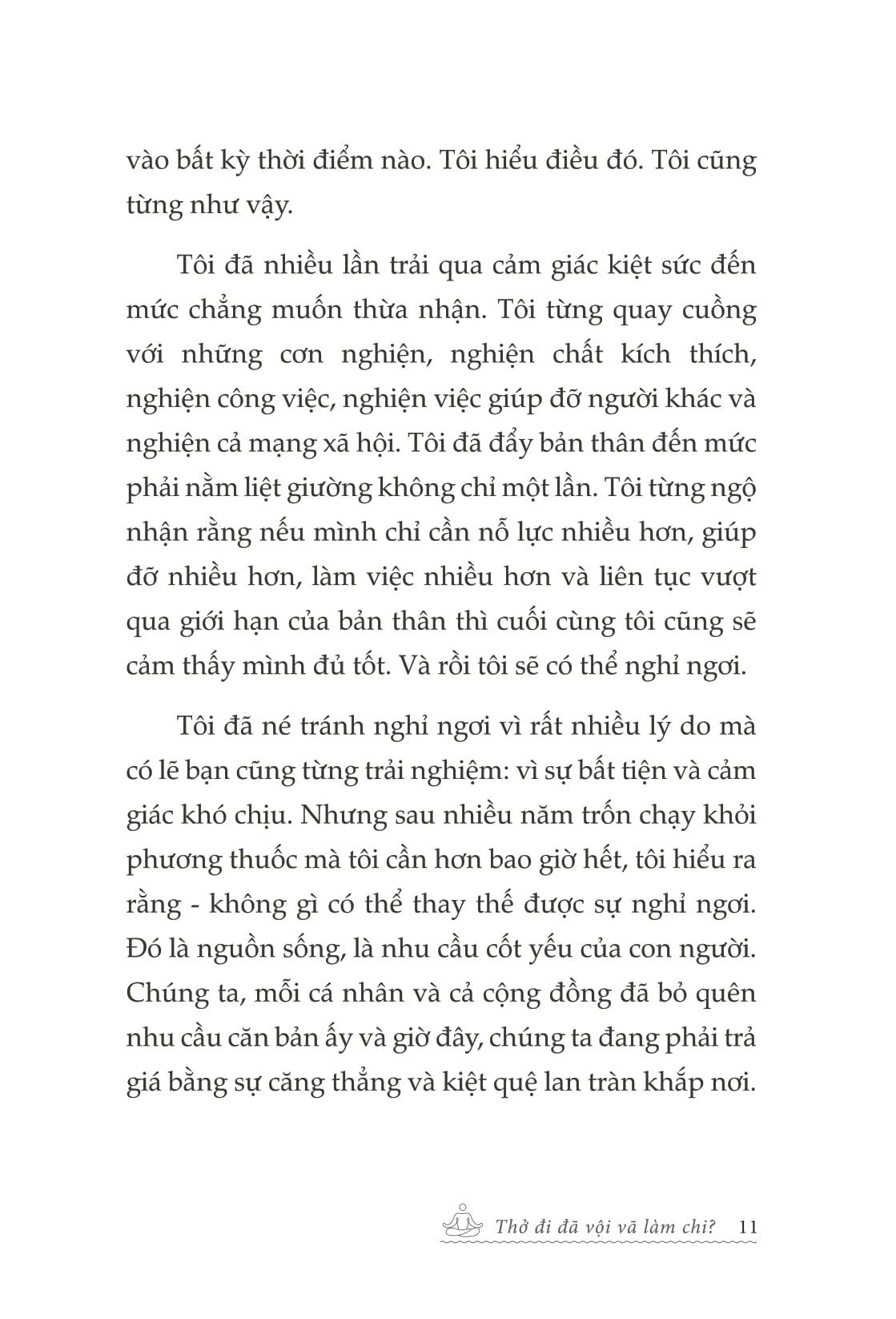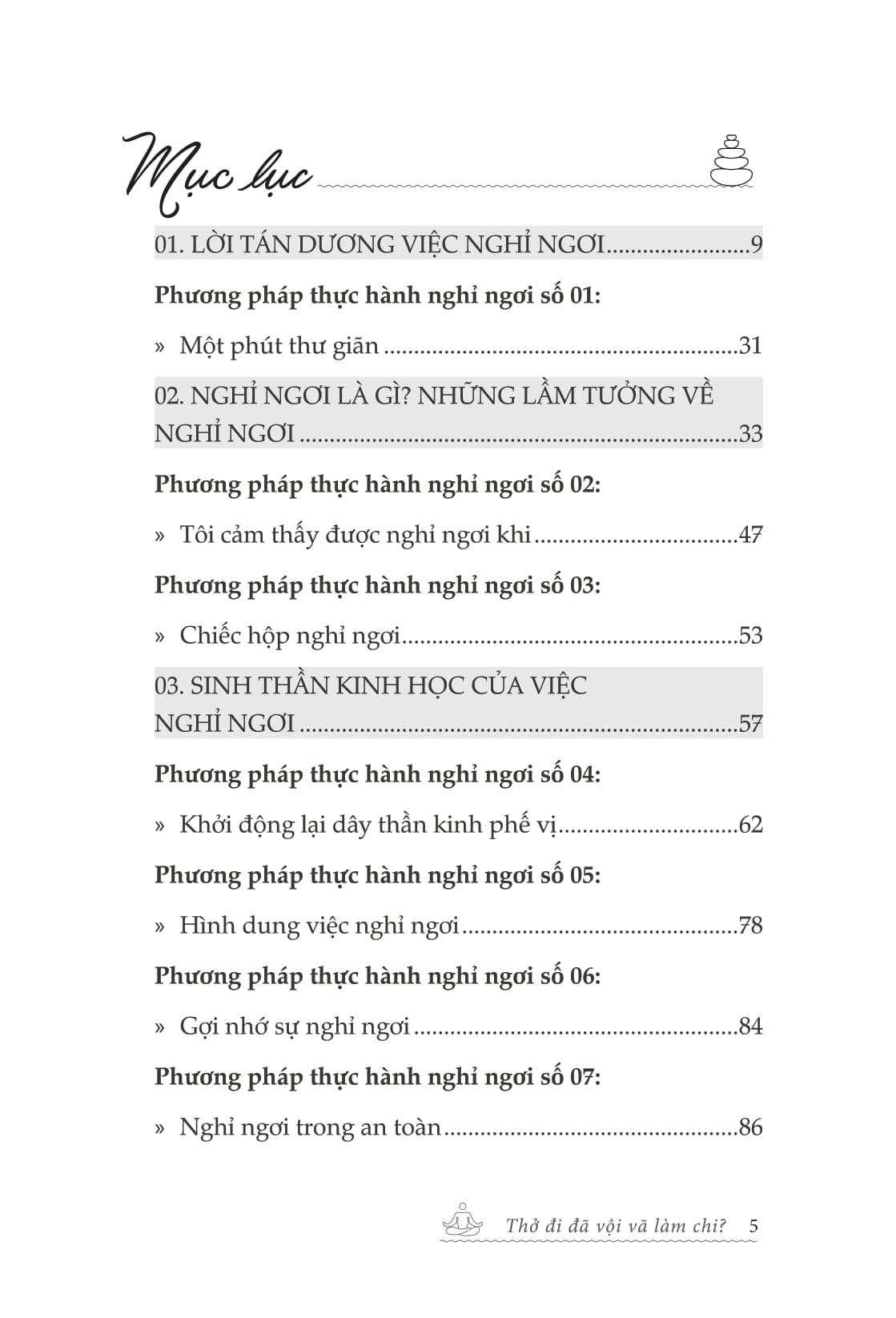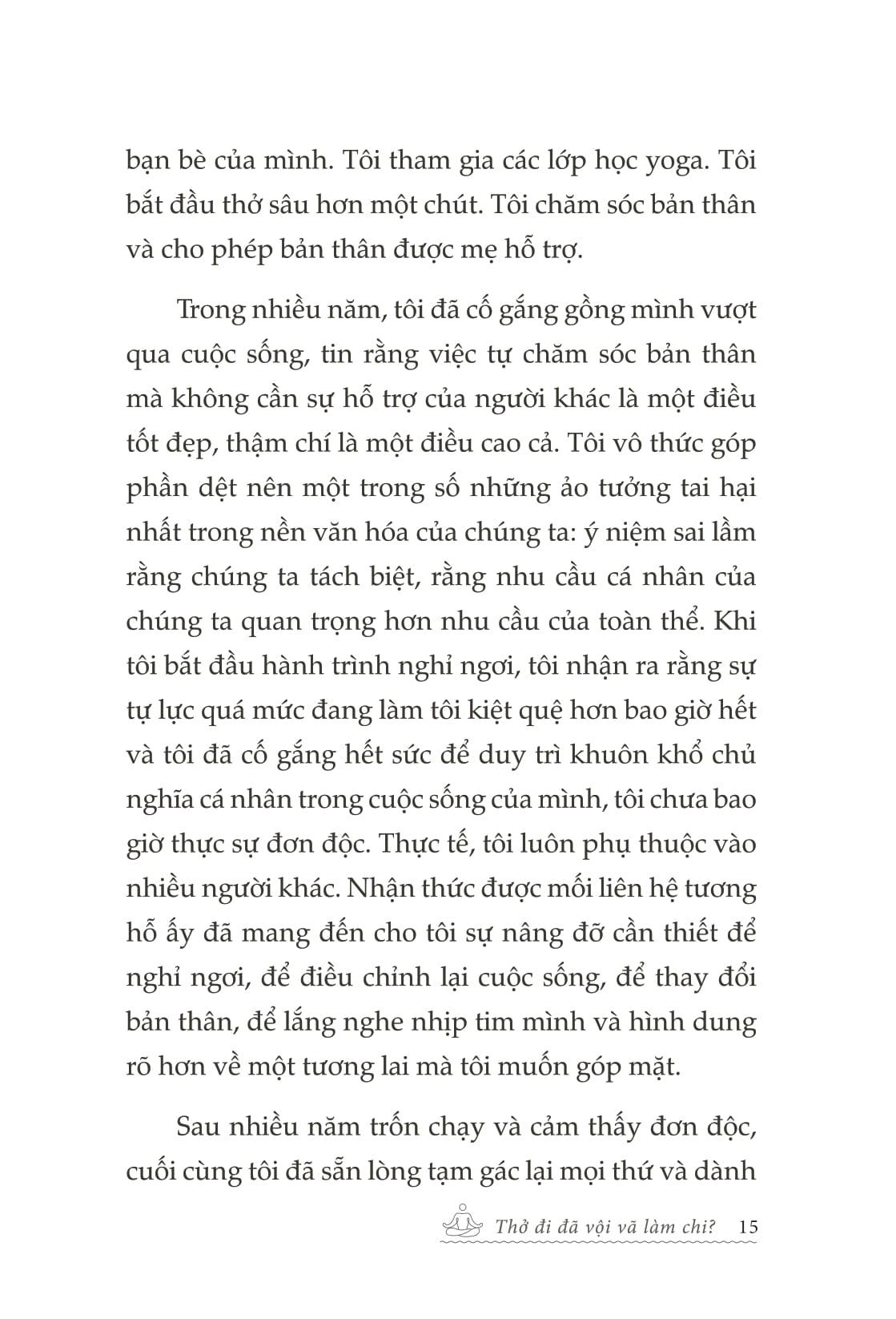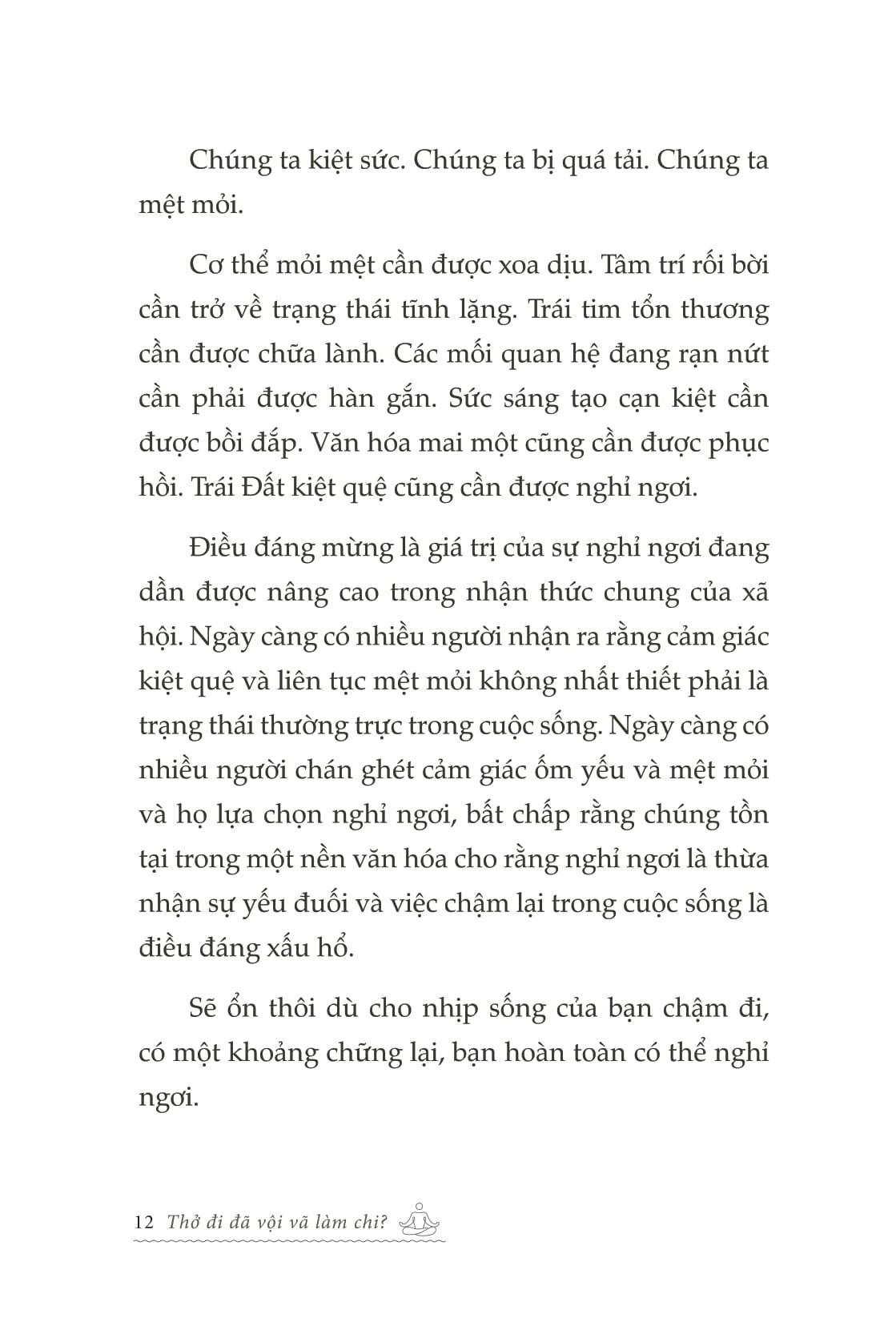 Mua tại TiktokThở Đi Đã - Vội Vã Làm Chi “Thở Đi Đã, Vội Vã Làm Chi” là cuốn sách chữa lành dành cho những ai đang bị cuốn vào vòng xoáy của nhịp sống hiện đại. Với lời văn nhẹ nhàng, tinh tế và sâu sắc, cuốn sách nhắc nhở chúng ta về một điều tưởng chừng rất đơn giản nhưng lại dễ bị lãng quên: hít một hơi thở chậm, và sống thật sự với hiện tại. Không giáo điều, không hô hào, sách như một người bạn thủ thỉ bên tai, khơi gợi cảm giác bình yên từ những điều nhỏ bé quanh m.ình. Nội dung chính của cuốn sách Cuốn sách gồm nhiều đoạn tản văn ngắn, mỗi chương là một lời nhắc nhở dịu dàng để ta quay về với chính m.ình. Nội dung tập trung vào các chủ đề: