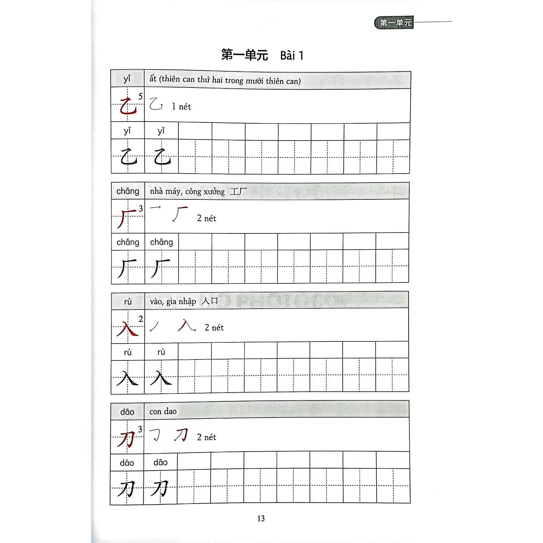 - Mỗi bài học trong sách gồm 20 chữ Hán, cuối bài học là phần thực hành.