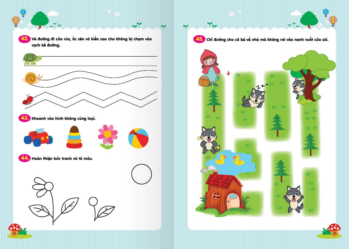 vẽ vui nhộn. Các bài tập, trò chơi kết hợp giữa rèn luyện tư duy với kiến thức tự nhiên và xã hội mà trẻ đã quen thuộc như: mê cung, ghép hình, tìm quy luật chung… phù hợp nhận thức của trẻ từ 3 - 6 tuổi giúp các bé rèn luyện và phát triển các kĩ năng cần thiết: quan sát, tưởng tượng, sáng tạo, ghi nhớ, tư duy logic và giải quyết vấn đề,…