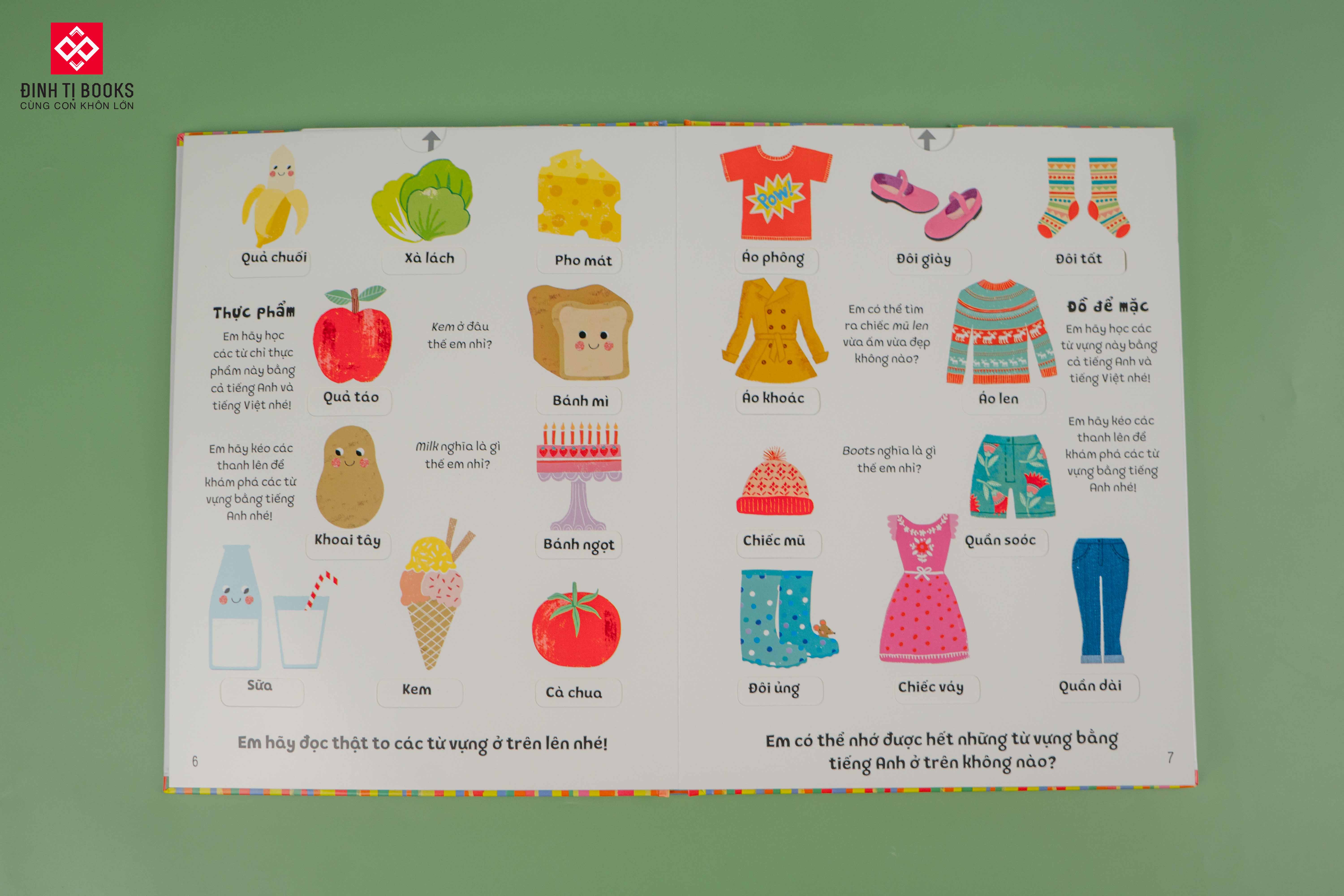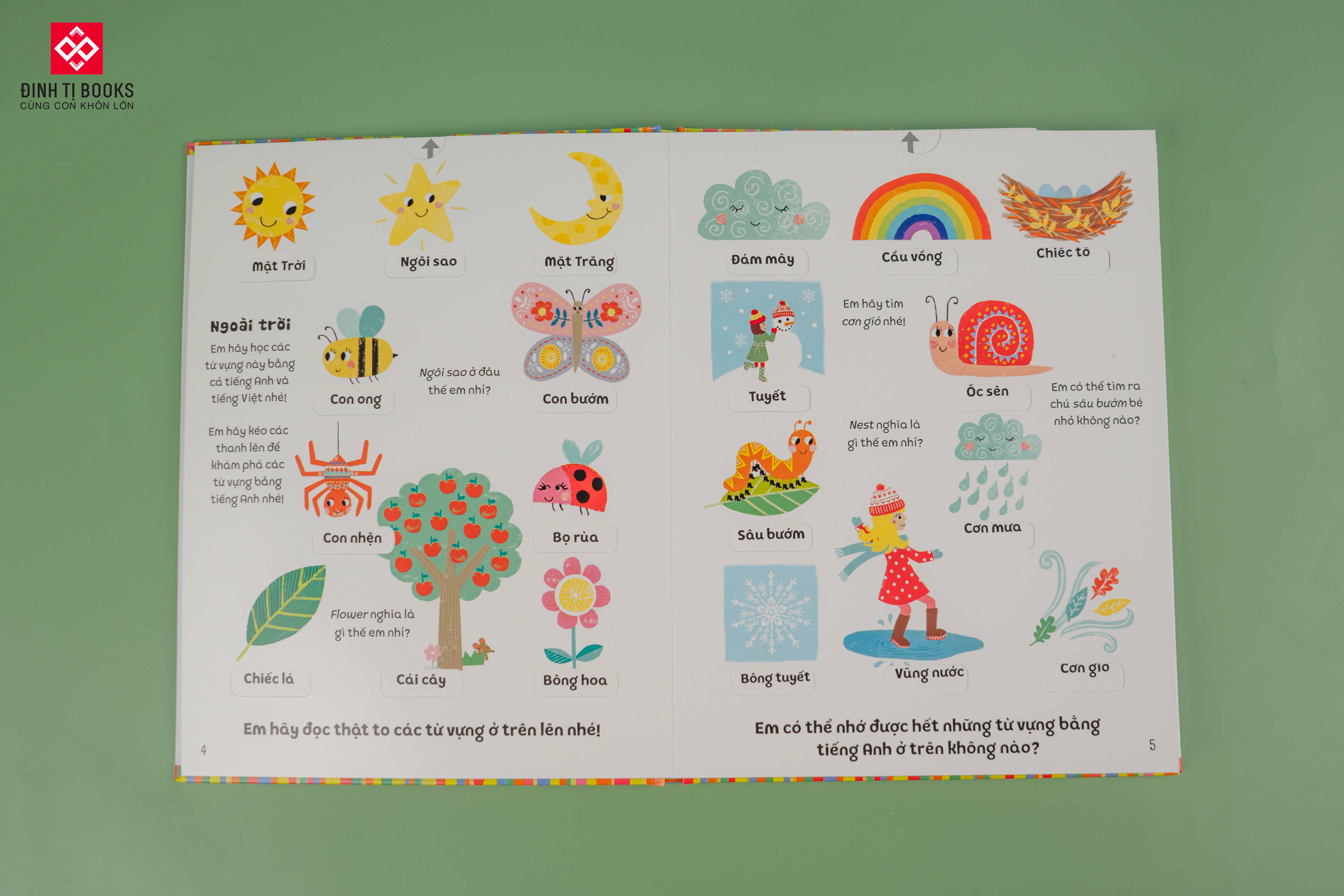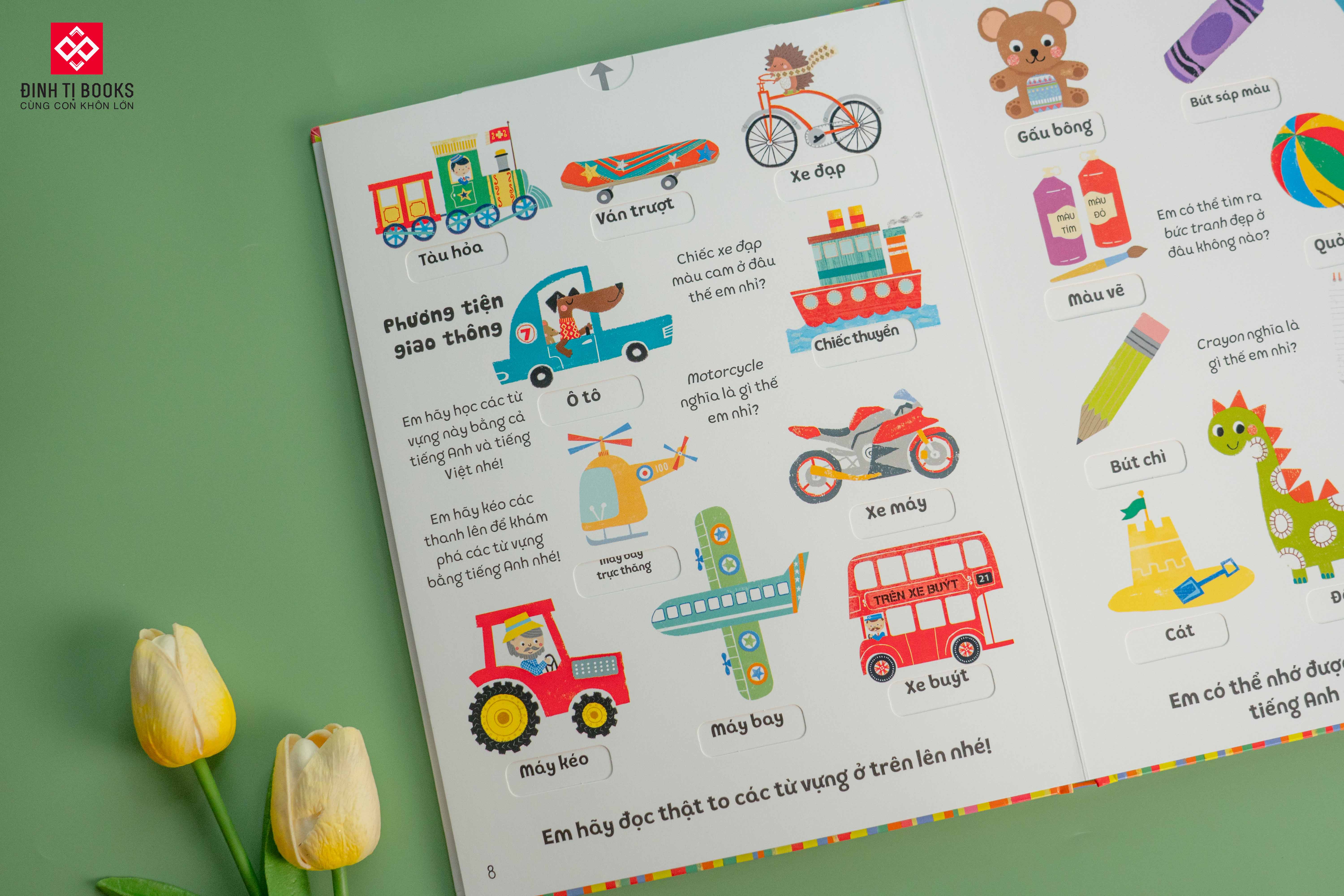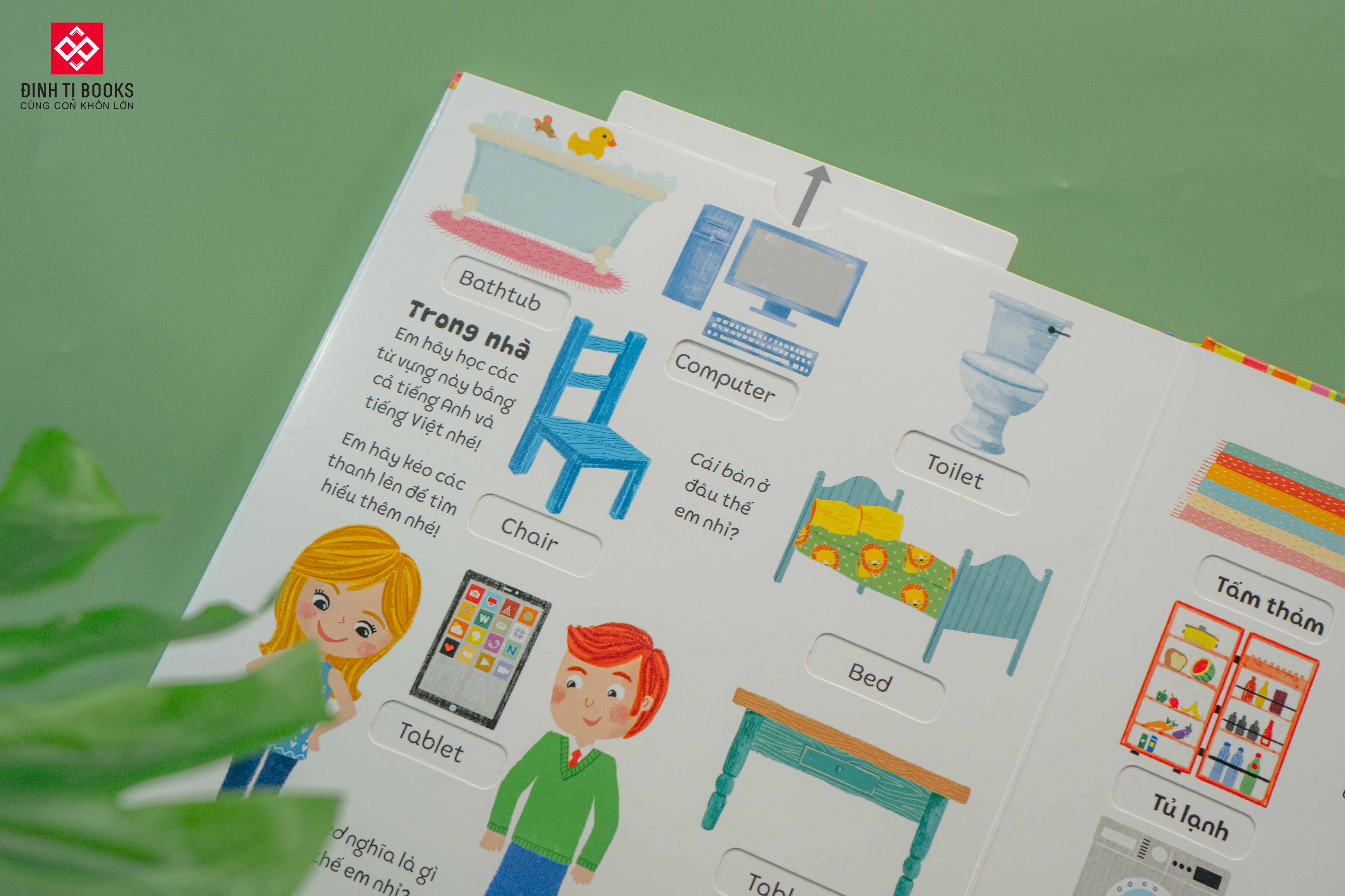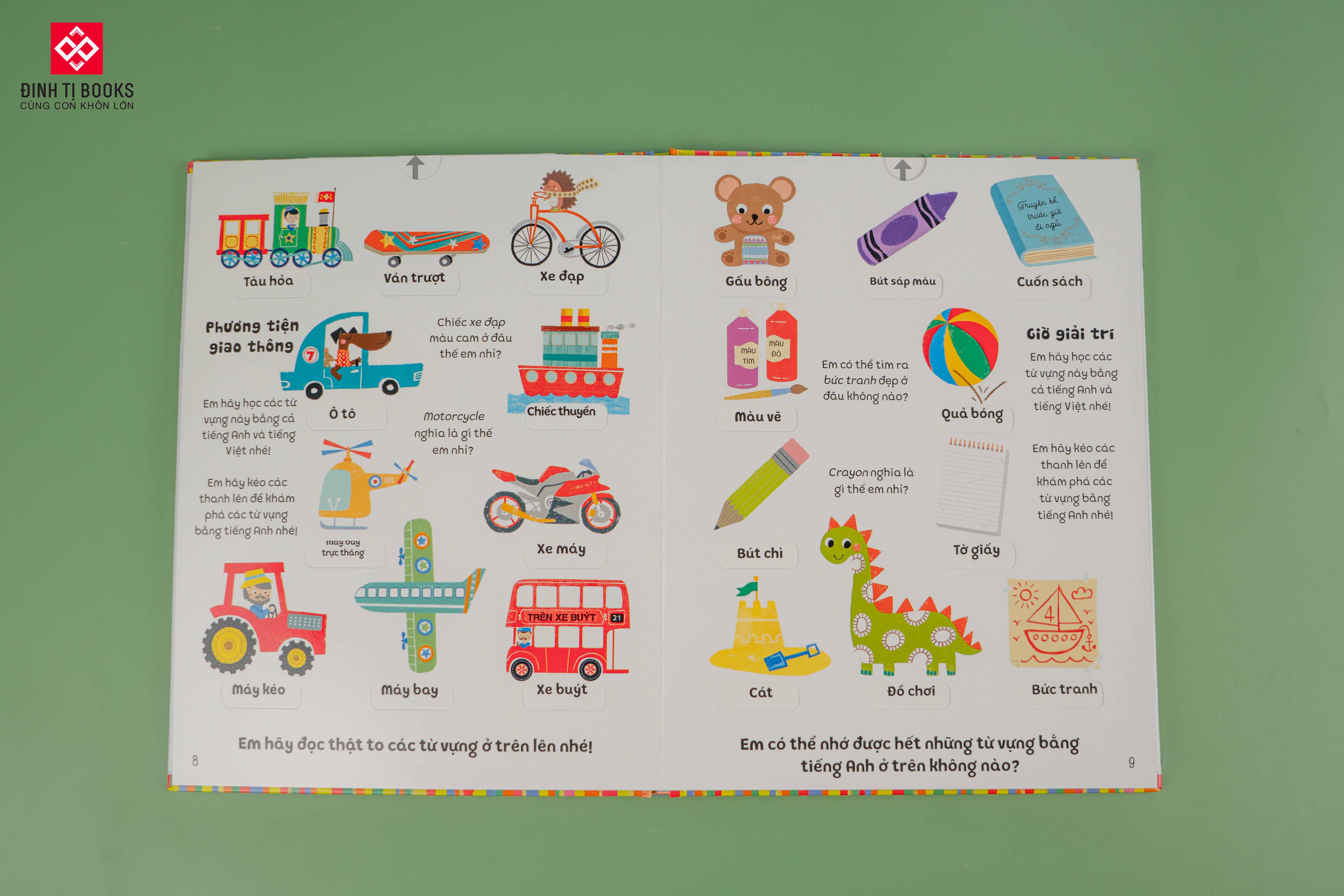 Dưới mỗi hình ảnh là từ vựng Tiếng Việt. Và chỉ cần trẻ kéo những thanh bìa cứng là những từ vựng tiếng Anh tương ứng hiện ra, thú vị như một trò chơi lại giúp trẻ ghi nhớ tốt hơn.