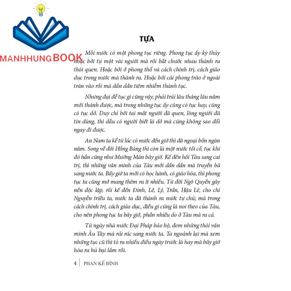 Mỗi nước có một phong tục riêng. Phong tục ấy kỳ thuỷ hoặc bởi tự một vài người mà rồi bắt chước nhau thành ra thói quen. Hoặc bởi ở phong thổ và cách chính trị, cách giáo dục trong nước mà thành ra. Hoặc bởi các phong tào ở ngoài tràn vào rồi mà dần dần tiêm nhiễm thành tục. Nhưng đại để tục gì cũng vậy, phải trải lâu tháng lâu năm mới thành được, mà trong những tục ấy cũng có tục hay, cũng có tục dở. Duy chỉ bởi tai mắt người đã quen, lòng người đã tin dùng, thì dẫu có người biết là dở mà cũng không sao đổi ngay đi được.