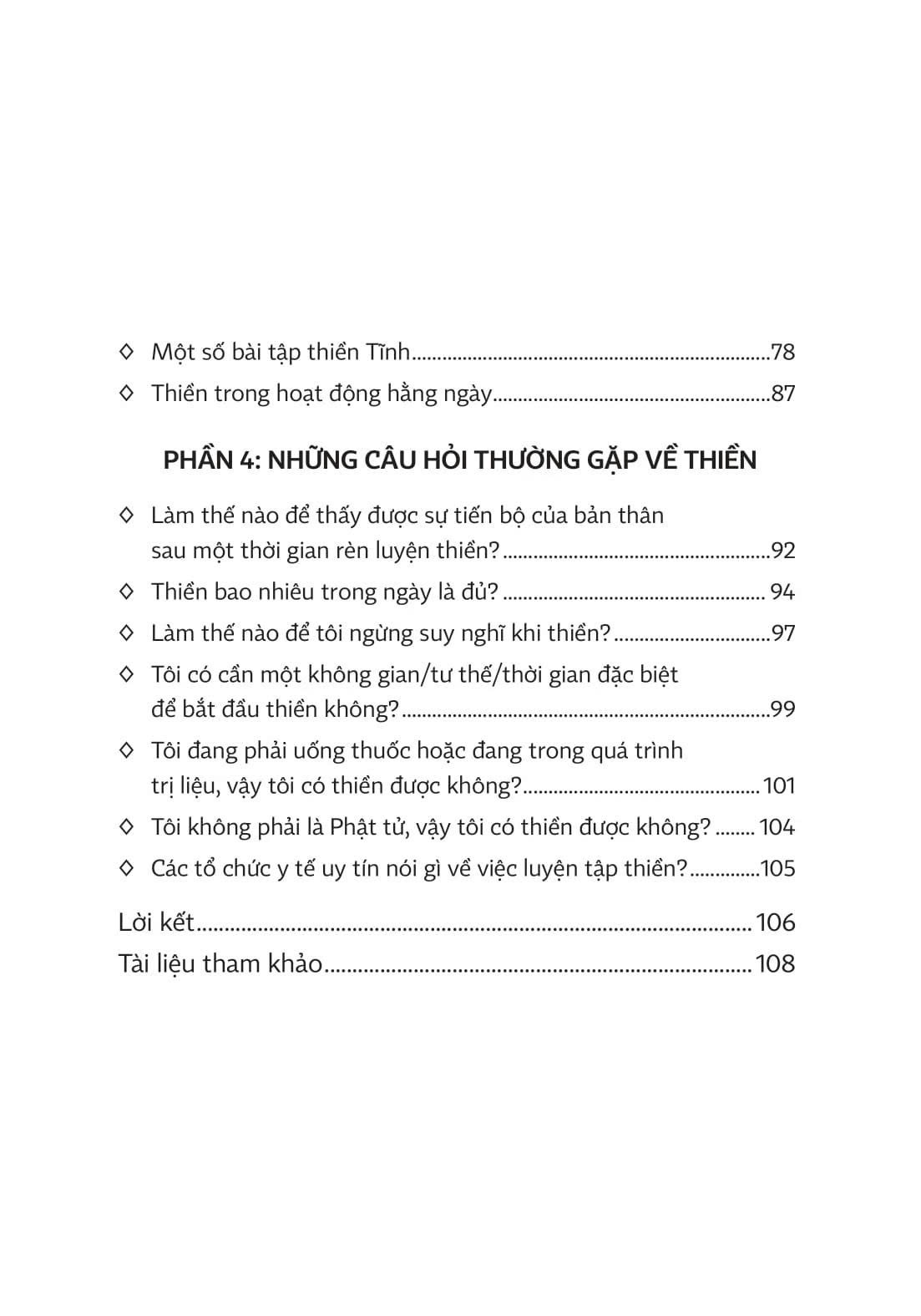 Cuốn sách này sẽ giúp bạn hiểu rằng thiền không phải là một sự thực hành mang tính tôn giáo mà là một loại hình thể dục cho tâm trí. Qua các nghiên cứu khoa học, thiền đã được chứng minh là có những tác động tích cực đến sức khỏe tinh thần và thể chất. Nó không chỉ giúp giảm căng thẳng, lo âu mà còn cải thiện khả năng tập trung và trí thông minh của chúng ta. Không những vậy, những phát hiện khoa học mới đây cho thấy thiền còn có thể giúp chống lão hóa.