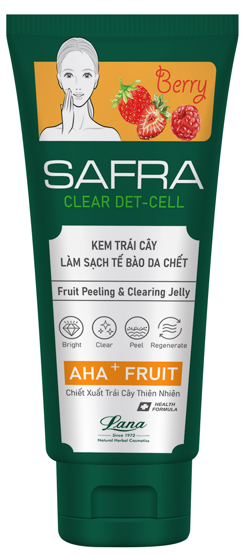 Mua tại TiktokKem trái cây làm sạch tế bào chết SAFRA Clear Det-cell có chứa AHA chiết xuất từ trái cây tươi (Táo, Nho, Dâu, Chanh, Dưa Gang) hoàn toàn từ tự nhiên