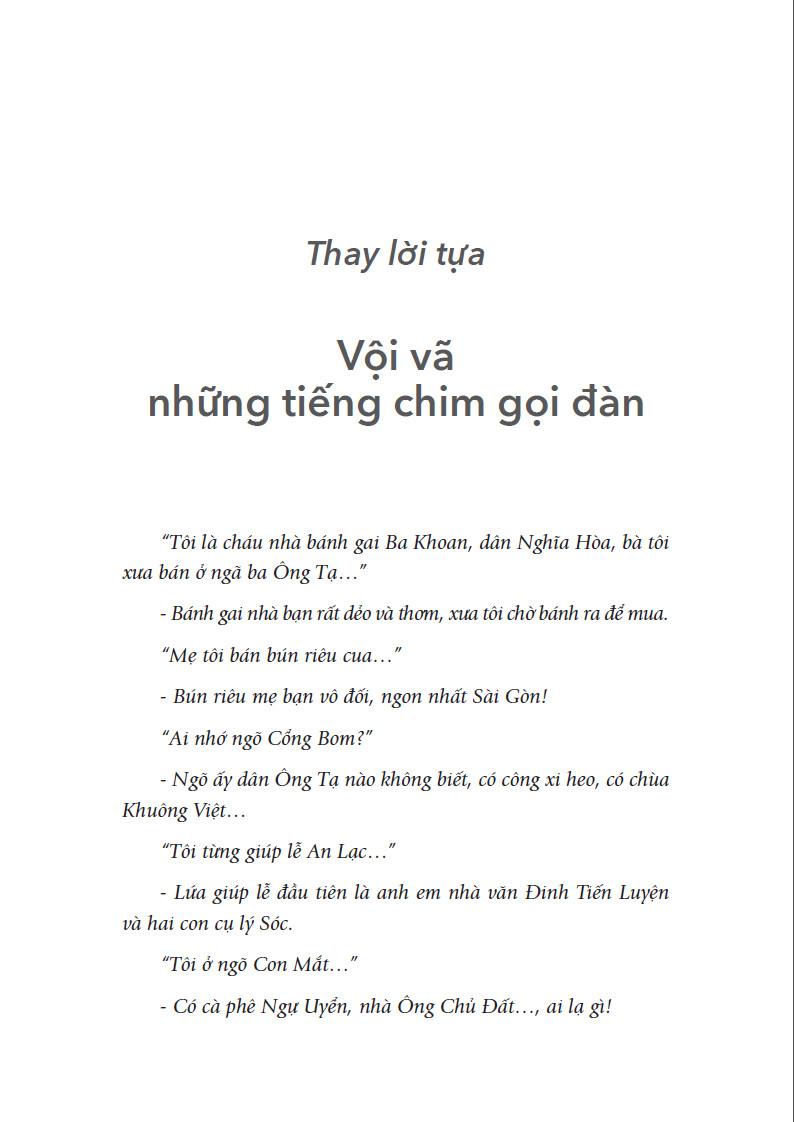 Thêm một điểm đặc biệt nữa, đó là trong quyển sách này, bạn đọc sẽ được “gặp” không ít người nổi tiếng. Ngõ Con Mắt, xóm Đại Lợi, giáo xứ Nghĩa Hòa…những cái tên tuy khá xa lạ với những người không phải dân cố cựu nhưng mấy ai biết rằng nơi đây từng là nơi cư ngụ của gia đình nhiều nghệ sĩ nổi tiếng như diễn viên Đại Nghĩa, ca sĩ Tóc Tiên, nhà thơ Đỗ Trung Quân, nhà văn/MC Nguyễn Ngọc Ngạn, nhạc sĩ Nguyễn Vũ - tác giả “Bài Thánh ca buồn” mà lời ca và giai điệu quen thuộc vang lên trong mỗi mùa Giáng Sinh, nhạc sĩ Văn Giảng của “Ai về sông Tương”, nhạc sĩ Hoài An gắn liền với nhiều bài nhạc Xuân trước 1975 phổ biến đến tận ngày nay mà người ta vẫn thường hát trong những ngày Tết… và còn rất nhiều thi sĩ, họa sĩ, nhà báo có tiếng ở Sài Gòn không thể kể hết tên.