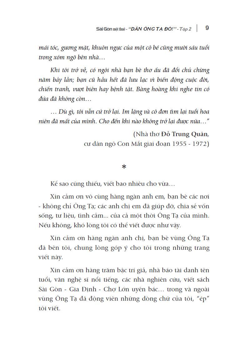 Những ai đã từng yêu mến vùng Ông Tạ qua miêu tả của tác giả Cù Mai Công hẳn sẽ rất vui khi trong quyển sách Sài Gòn một thuở: “Dân Ông Tạ đó!”- Tập 2, tác giả sẽ tiếp tục dẫn bạn đọc đi sâu vào từng ngõ hẻm, thăm từng căn nhà, gặp gỡ những nhân vật đã làm nên một trời tuổi thơ đầy kỷ niệm của anh cũng như của nhiều cư dân Ông Tạ khác.