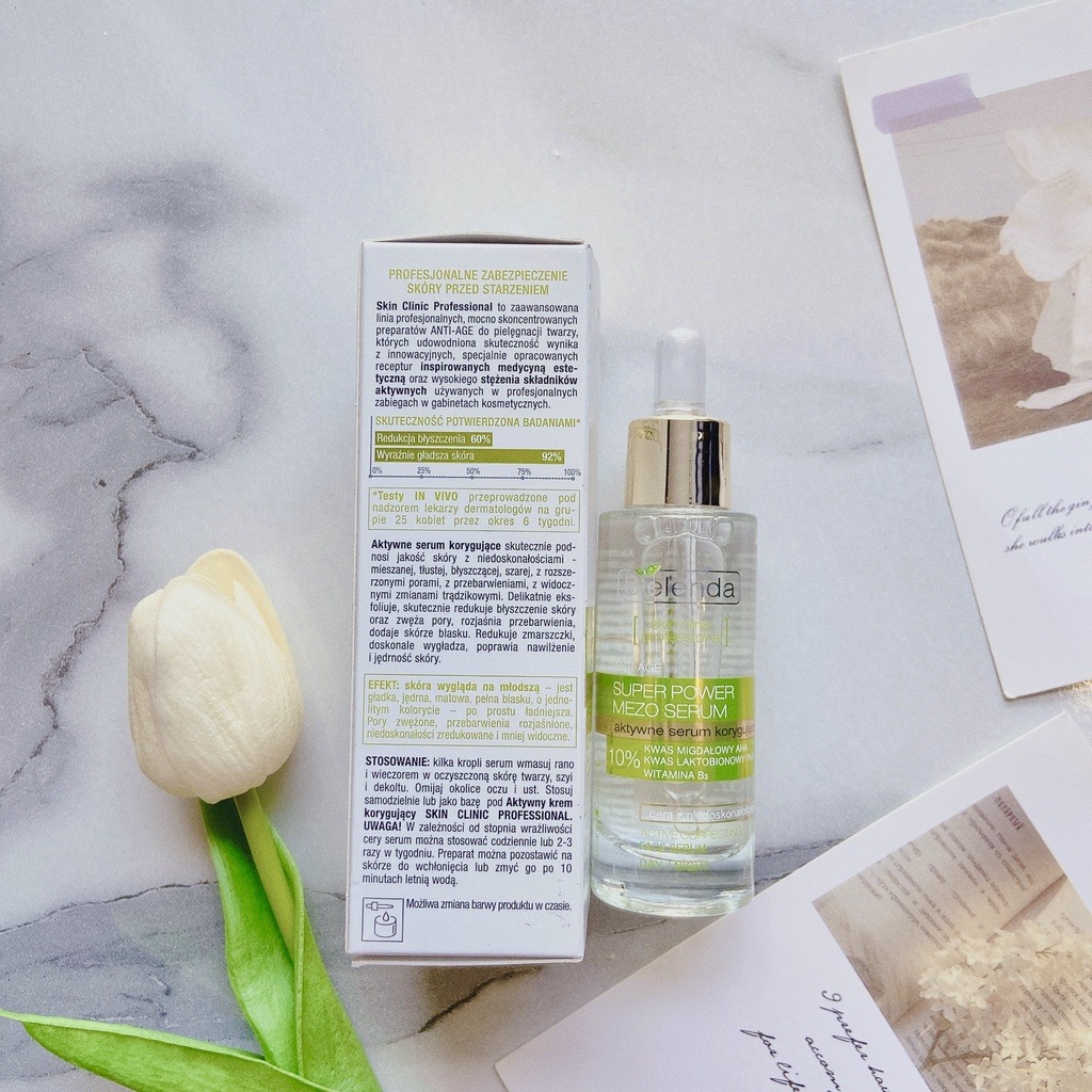 Huyết Thanh Tươi Bielenda Skin Clinic Professional cải thiện hiệu quả chất lượng Da - hỗn hợp, Nhờn, Xỉn màu với lỗ chân lông to, Mụn trứng cá . Nhẹ nhàng tẩy tế bào chết, làm sáng da, Giảm thâm sẹo và thắt chặt lỗ chân lông, giúp da Trắng hồng hào, rạng rỡ. Nó làm giảm nếp nhăn, làm mịn, mướt và săn chắc da, ngăn ngừa chảy xệ.