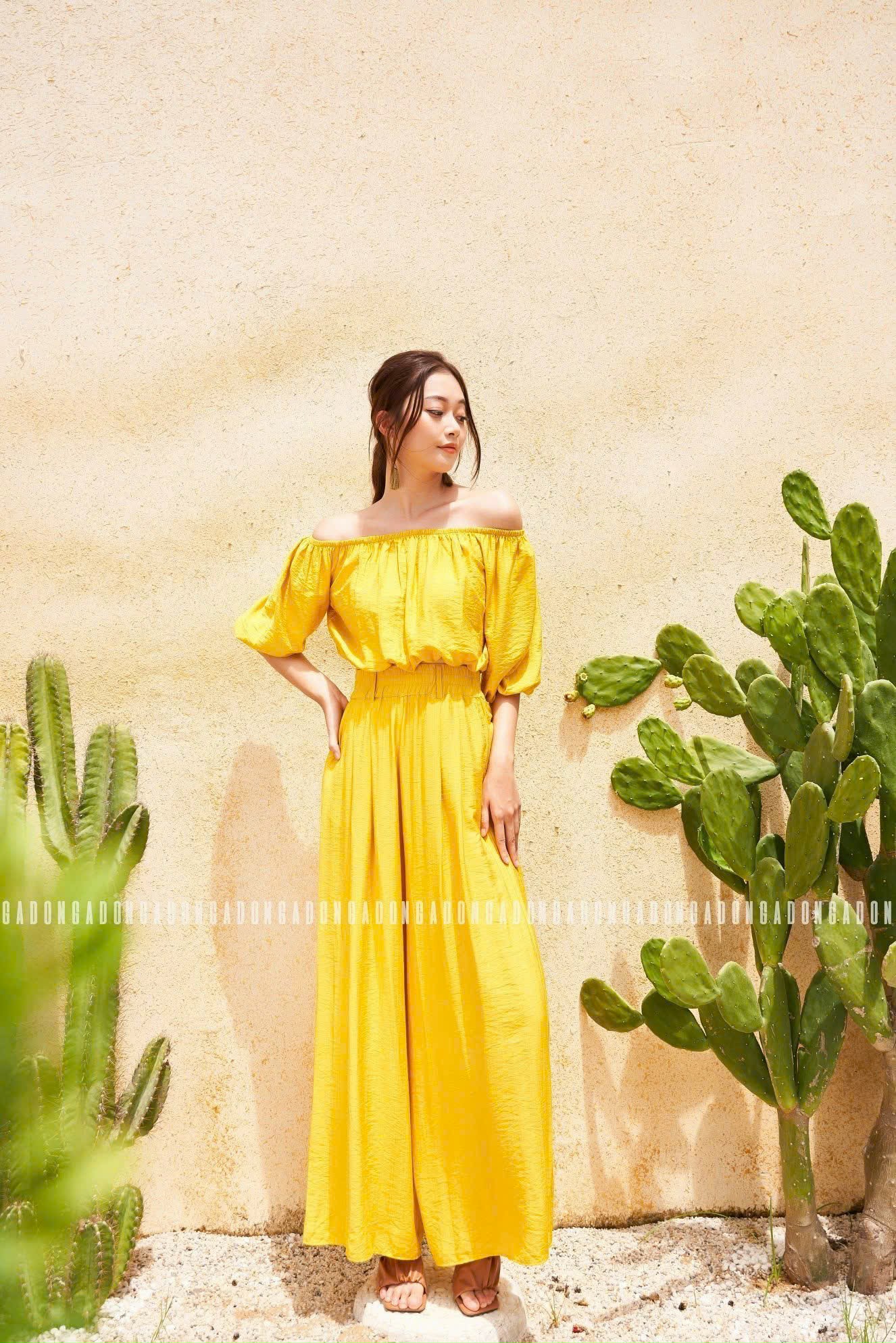 ღ THÔNG TIN SẢN PHẨM: Tên sản phẩm: Set áo quần vàng trễ vai Màu sắc: vàng Chất liệu: chéo dày Chi tiết sản phẩm: không lót, không túi. Thông