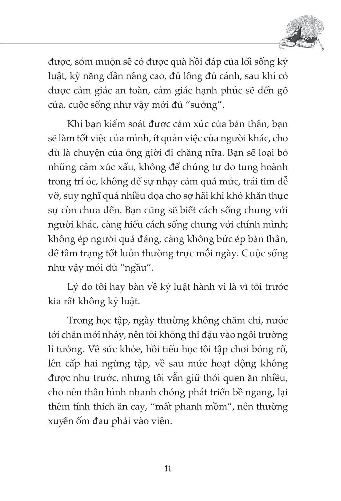 Rất nhiều người có thể gặp phải vấn đề suy nghĩ quá nhiều nhưng lại làm quá ít, đọc quá ít sách nhưng lại quá kỳ vọng vào người khác. Mọi người chi bằng thay đổi cách nhìn, sống kỷ luật hơn, kiềm chế lại cảm xúc một chút. Khi bạn áp kỷ luật vào hành vi của chính m.ình, bạn sẽ dựa vào năng lực bản thân để xác định phương hướng phát triển, đặt ra các mục tiêu ngắn hạn, trung hạn và dài hạn, sau đó phân tách chúng thành các mục tiêu nhỏ hơn và chia đều cho mỗi ngày. Sự thay đổi bình thường sẽ khiến bạn trở nên không còn tầm thường nữa. Một nguời giữ chữ tín, nói được làm được, sớm muộn sẽ có được quà hồi đáp của lối sống kỷ luật, kỹ năng dần nâng cao, đủ lông đủ cánh, sau khi có được cảm giác an toàn, cảm giác hạnh phúc sẽ đến gõ cửa, cuộc sống như vậy mới đủ “sướng"