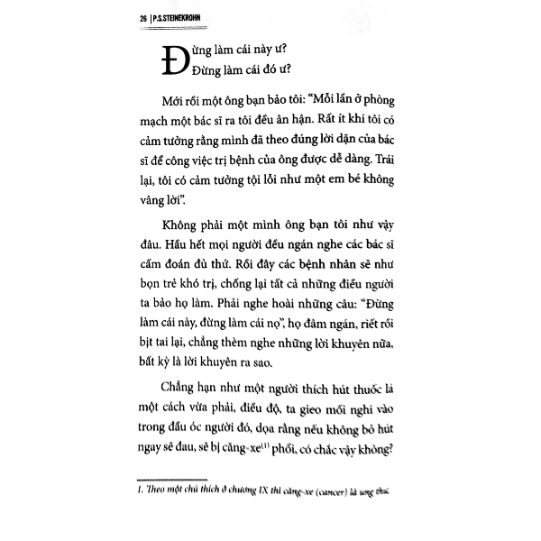 Sống Theo Sở Thích Để Sống Lâu Mới đọc lời giới thiệu bản tiếng Pháp, tôi nghĩ bụng: “Anh chàng này lập dị chăng? Là “lang băm chăng?” Bác sĩ gì mà viết sách khuyên người ta “cứ sống theo sở thích”, muốn ăn cho sướng miệng thì ăn, muốn uống rượu thì uống. Muốn hút thì hút. Mà muốn nằm dài ra suốt ngày thì cứ nằm! Từ xưa tới nay bác sĩ nào cũng cấm chúng ta đủ thứ, bắt chúng ta phải sống đúng phép vệ sinh mà sao ông Peter J.Steinekrohn này lại ăn nói ngược đời như vậy?” Nhưng đọc xong “Lời mở đầu” tôi thấy ông không phải là “lang băm”, ông đã hành nghề trong mấy chục năm, đông thân chủ – điều đó chưa đủ đảm bảo gì cả - ông lại diễn thuyết, viết báo viết sách dạy người ta đề phòng bệnh tật. Có “lang băm” nào lại nghĩ tới việc “trứ thư lập ngôn” đó? Rồi khi đọc hết cả mười chương, chương nào cũng thích thú - vì giọng ông rất hóm hỉnh - tôi nhận ra rằng mình đã ngờ oan ông. Ông can đảm chống lại ý kiến đại đa số các bạn đồng nghiệp của ông, làm cái “đích” cho bao nhiêu mũi tên tẩm độc mà không sờn lòng, nhưng chống lại một cách có lý, đầy lương thức, chứ không lập dị. Trong mười chương bàn về mười vấn đề, vấn đề nào ông cũng xét cả hai phương diện: lợi và hại, khi nào lợi, khi nào hại, lợi cho ai, hại cho ai? Tại sao? Chẳng hạn “vấn đề uống rượu”, uống nhiều thì có hại, tuổi trẻ không nên tập uống, nhưng đã ngoài bốn mươi tuổi mà chưa hề thích rượu thì không sợ thành nghiện nữa, và nếu hay ưu tư, kém ăn, khó ngủ thì có thể uống mỗi ngày một vài ly nhỏ, miễn là không bị những bệnh đau tim, loét bao tử, động mạch viê Về “vấn đề thể thao” cũng vậy, dưới 30 nên tập thể thao – hồi trẻ ông là một thể thao gia - nhưng từ 40 tuổi nếu không thích vận động mà thích nằm ghế xích đu thì đừng nên đua đòi người ta, đừng sợ dư luận, mà miễn cưỡng chạy nhảy tập tành, hại hơn là lợi. Chủ trương của ông là không có một quy tắc bất di bất dịch nào áp dụng cho mọi người được mà cũng không có phương pháp trị bệnh nào công hiệu cho mọi bệnh nhân. Mập quá thì hại cho tim, cho động mạch, cần phải bớt ăn cho sút cân, nhưng một bà già 70 tuổi dù có dư hai ba chục ký lô thì cũng đừng nên bắt bà ta thay đổi cách ăn uống và lối sống. Hóa công đã cho bà mập mà vẫn thọ thì công trình của hóa công tuyệt hảo rồi, đừng theo sở kiến hẹp hòi, nông cạn của ta mà đòi sửa đổi, chỉ “lợn lành” hóa “lợn toi” thôi. Trong sách toàn những lời khuyên khá sáng suốt, xác đáng như vậy. Ông không lập dị chút nào cả! Đáng quý hơn nữa là ông có một nhân sinh quan rất khoáng đạt. Trong “Lời mở đầu” ông viết: “Triết lý của tôi như vầy: chúng ta chỉ sống có một lần thôi. Hôm qua là dĩ vãng, ngày mai là hy vọng, hôm nay là đời sống. Mỗi ngày chúng ta cứ sống cho thỏa thích, nếu không thì không phải là sống. Chỉ có mỗi một quy tắc mà bạn phải theo là quy tắc của cổ nhân: Đừng thái quá”. Trong chương VII, xét về bệnh ưu tư của thời đại, ông khuyên: “Khi bạn kiếm được nhiều tiền quá, danh vọng cao quá, thiên hạ cúi rạp xuống chào bạn, bạn thử đặt lên bàn cân xem: một bên là sự thành công, một bên là sức khoẻ bị tiêu mòn, gia đình không vui, bạn bè thưa thớt, bên nào nặng, bên nào nhẹ? Bây giờ đã thành công rồi, bạn có chịu trả một giá đắt như vậy để mua cái danh lợi hão huyền kia nữa không? Thực thích thú mà được nghe một bác sĩ nổi tiếng là duy vật nói như vậy. Ông Steinekrohn không phải chỉ là một bác sĩ mà còn là một triết gia nữa. Tôi nhận thấy khoa học phương Tây sau một hai thế kỷ thắng được thiên nhiên trong vài khu vực mà sinh ra tự hào, coi thường thiên nhiên, thì từ sau thế chiến vừa rồi đã bắt đầu tự nhận là lầm lẫn, đôi khi muốn trở về với thiên nhiên, chẳng hạn trong việc trồng trọt, chăn nuôi, người ta đã ngờ rằng dung nhiều chất hóa học để diệt trùng, bồi bổ cho cây và súc vật mau lớn, chưa chắc là có lợi mà có thể có hại. Về sự nuôi trẻ, xưa người ta khuyên phải cho bú, cho ngủ đúng giờ, cấm trò bú tay, ngày nay người ta chủ trương ngược lại, như các ông bà ta hồi xưa: trẻ đòi bú thì cho bú, buồn ngủ thì cho ngủ, tha hồ được mút cái núm vú cao su. Về y khoa, nhiều bác sĩ đã cảnh cáo không nên hơi chút là đè bệnh nhân ra cắt “hạch hầu long” (amygdale), ruột dư, hoặc cắt cả trái mật, bao tử, như vậy trái với thiên nhiên, sẽ mang họa vì công trình nào của thiên nhiên cũng hoàn hảo. Phải tìm ra nguyên nhân của bệnh về thể chất và về tinh thần, tâm lý, do đó mà môn “tâm thể y học” (médecine psychosomatique) hiện nay đang được coi trọng. Ông Steinekrohn thuộc hạng bác sĩ tân tiến đó, khi ông khuyên người ta sống theo thiên nhiên, nghĩa là một cách điều độ và hợp với bản tính của m