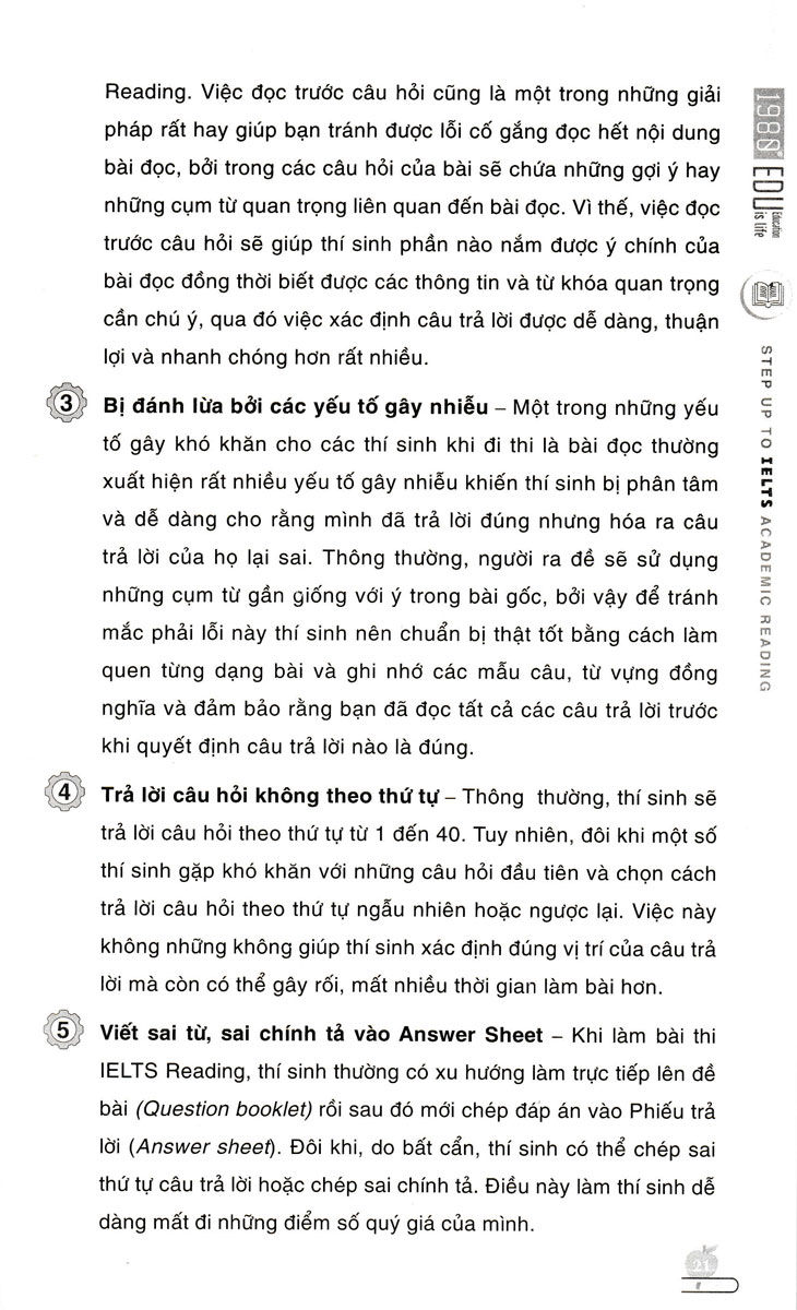 Cuốn sách “Step Up To IELTS Academic READING” nằm trong bộ sách “Step up to IELTS Academic” là bộ sách gồm bốn kỹ năng “listening/ speaking/ reading/ writing” được cô đọng kiến thức và hỗ trợ tối đa cho thí sinh trong việc làm quen dạng đề và nhận diện dạng bài. Đặc biệt là định hình và xây dựng thói quen, phương pháp học tập hiệu quả để hệ thống kiến thức, dành cho người mới bắt đầu và muốn ôn luyện chuyên sâu; tổng hợp đầy đủ nhất các dạng bài trong đề thi IELTS. Thí sính sẽ dễ dàng nắm bắt được trọng điểm kiến thức để học nhanh nhớ lâu.