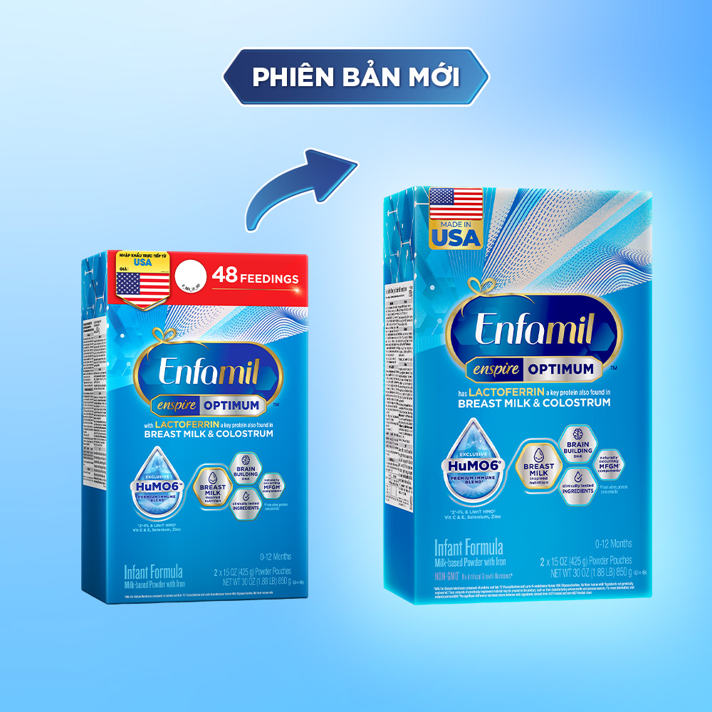 - Lactoferrin được coi là một phần của hệ miễn dịch bẩm sinh, chống lại các tác nhân vi khuẩn xâm nhập vào cơ thể, chủ yếu là thông qua các mô niêm mạc. Thành phần Sữa Bột Enfamil Enspire Infant Formula Sữa bột tách béo, đường Lactose, dầu thực vật (dầu cọ olein, dầu dừa, dầu đậu nành và dầu hướng dương giàu oleic), đạm whey cô đặc (nguồn MFGM), ít hơn 2%: lactoferrin, galactooligosaccharides, polydextrose, dầu Mortierella Alpina (nguồn ARA), dầu Crypthecodinium Cohnii (nguồn DHA), kali citrat, canxi cacbonat, canxi phốtphát, natri clorid, kali clorid, sắt sulphát, magie oxit, kẽm sulphát, đồng sulphát, mangan sulphát, kali iodid, natri selenit, chất nhũ hóa (lecithin đậu nành), choline clorid, axit ascorbic, niacinamide, canxi pantothenat, riboflavin, thiamin hydroclorid, vitamin D3, vitamin B6 hydroclorid, axit folic, vitamin K1, biotin, vitamin B12, inositol, vitamin E axetat, vitamin A palmitate, nucleotide (cytidine 5’-mono phốtphát, dinatri uridine 5’-mono phốtphát, adenosine 5’-mono phốt phát, dinatri guanosine 5’-mono phốtphát), taurin, L-carnitine. Sản phẩm có chứa sữa và đậu nành. Hướng dẫn sử dụng