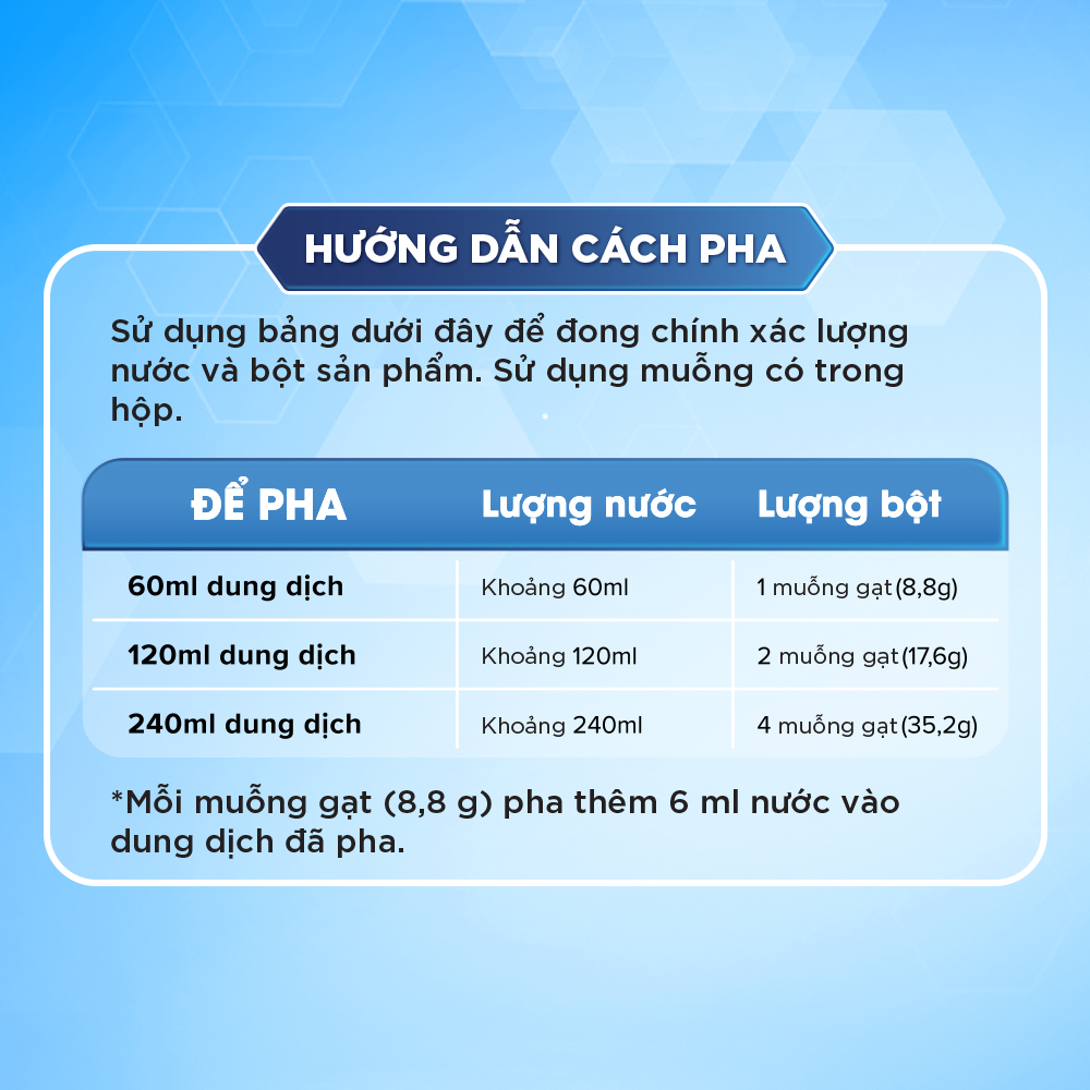 - Hướng dẫn cách sử dụng Sử dụng bảng dưới đây để đong chính xác lượng nước và bột. Sử dụng muỗng có trong hộp và bảo quản KHÔ RÁO ở rãnh kẹp trên nắp. Hướng dẫn bảo quản