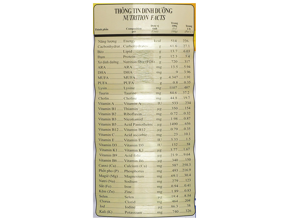 1. Thành phần: Sữa bột, Whey protein, Soy protein, Maltodextrin, Sữa non, L-Lysine HCL, FOS, Canxi Nano, Taurine, Choline, DHA, ARA, Vitamin (Vitamin A, Vitamin C, Vitamin D, Vitamin E, Vitamin D3, Vitamin K2,