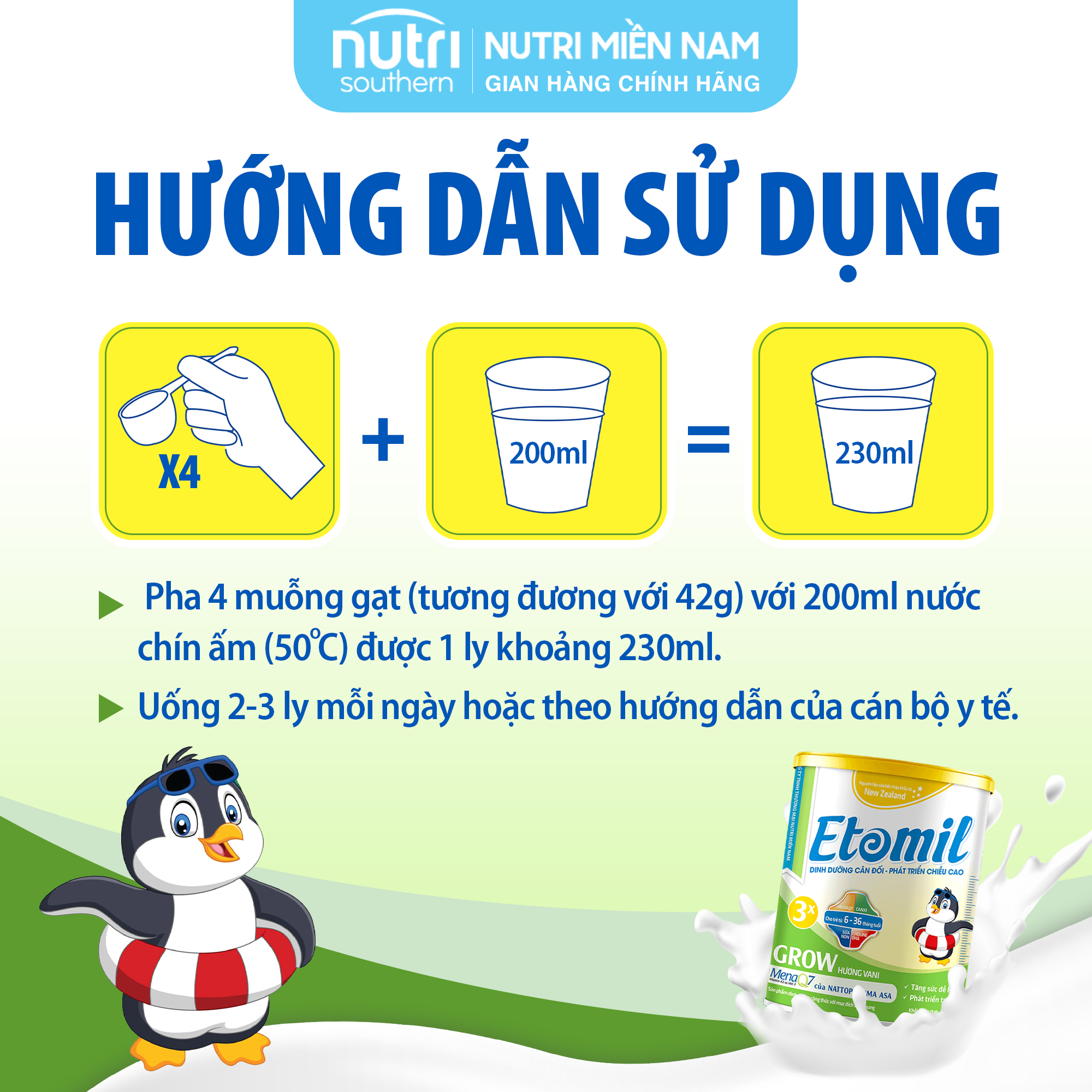 Pha 4 muỗng gạt (tương đương với 42g) với 200ml nước chín ấm (50oC) được 1 ly khoảng 230ml.