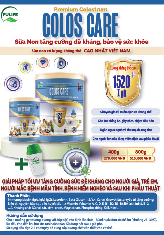 Bổ sung sữa non COLOS CARE tương đương với khoảng 300mg kháng thể IgG có trong 16g pha chuẩn, sẽ hỗ trợ tăng cường sức đề kháng giúp chống lại sự xâm nhập của các nhân tố gây hại đối với cơ thể và xây dựng một hệ miễn dịch khỏe mạnh, giúp tránh khỏi một số căn bệnh nghiêm trọng như ung thư hoặc các bệnh liên quan đến tim mạch.