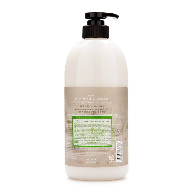Sữa tắm massage hương sữa vani Welcos Body Phren Shower Gel với thành phần chứa Protein sữa không chỉ cuốn trôi bụi bẩn, bã nhờn và làm sạch da mà còn cung cấp dưỡng chất để da luôn trắng sáng, mịn màng cùng mùi hương vani ngọt ngào, thư giãn.