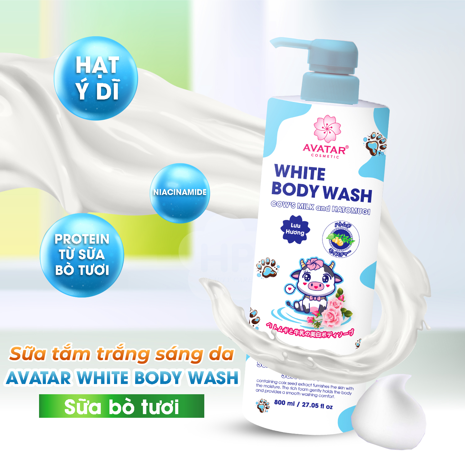 SỮA TẮM TRẮNG SÁNG DA SỮA BÒ TƯƠI AVATAR WHITE BODY WASH Số Lô: in trên sản phẩm Xuất Xứ: Việt Nam Thể tích thực: 800ml Mã Vạch: 8939183970941 - 8936183971085 Sữa tắm làm sạch