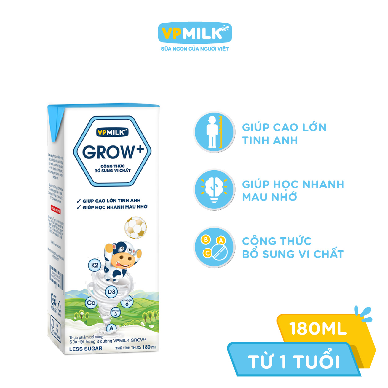 ✨Sữa Tiệt Trùng Ít Đường VPMilk Grow+ Hộp 180ml (Thùng 48 Hộp)