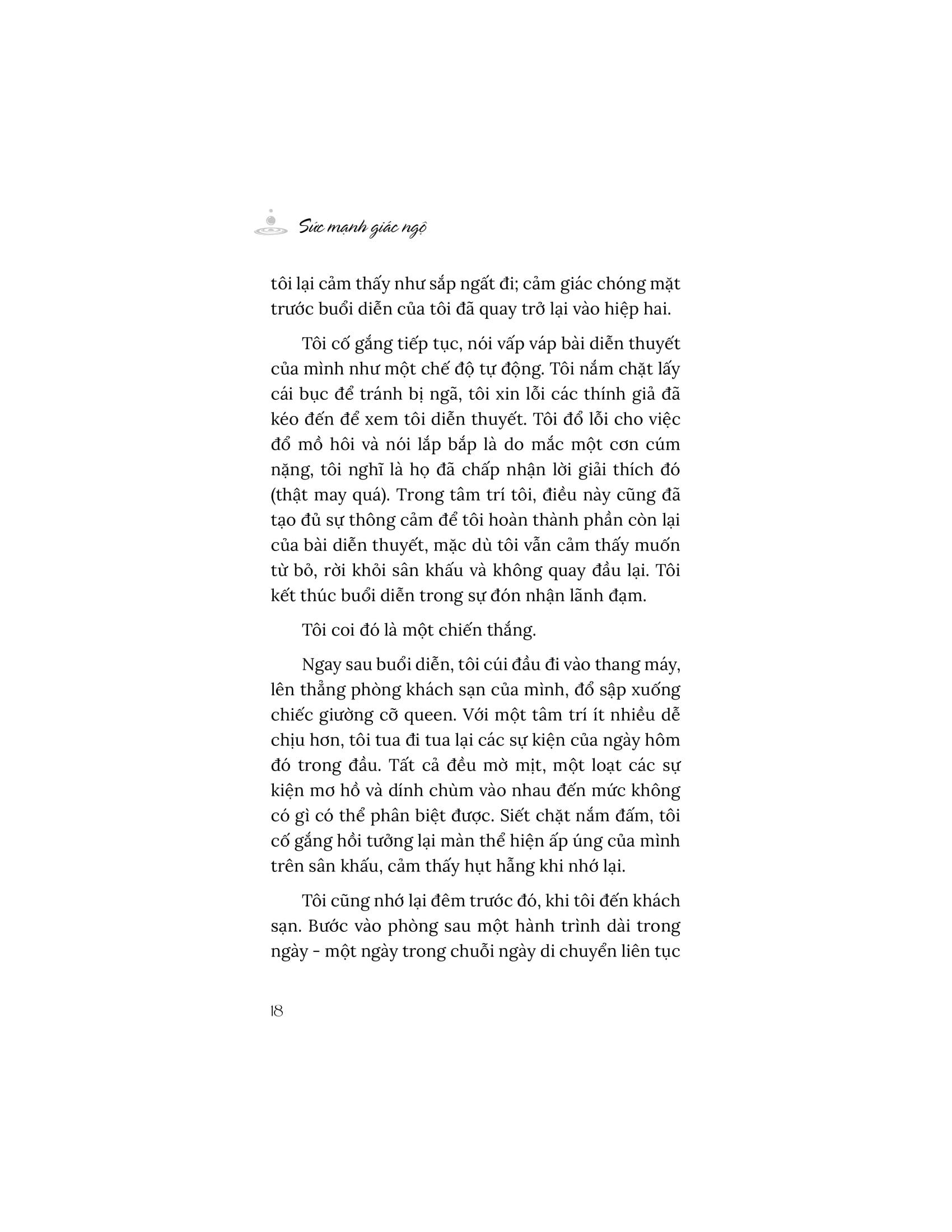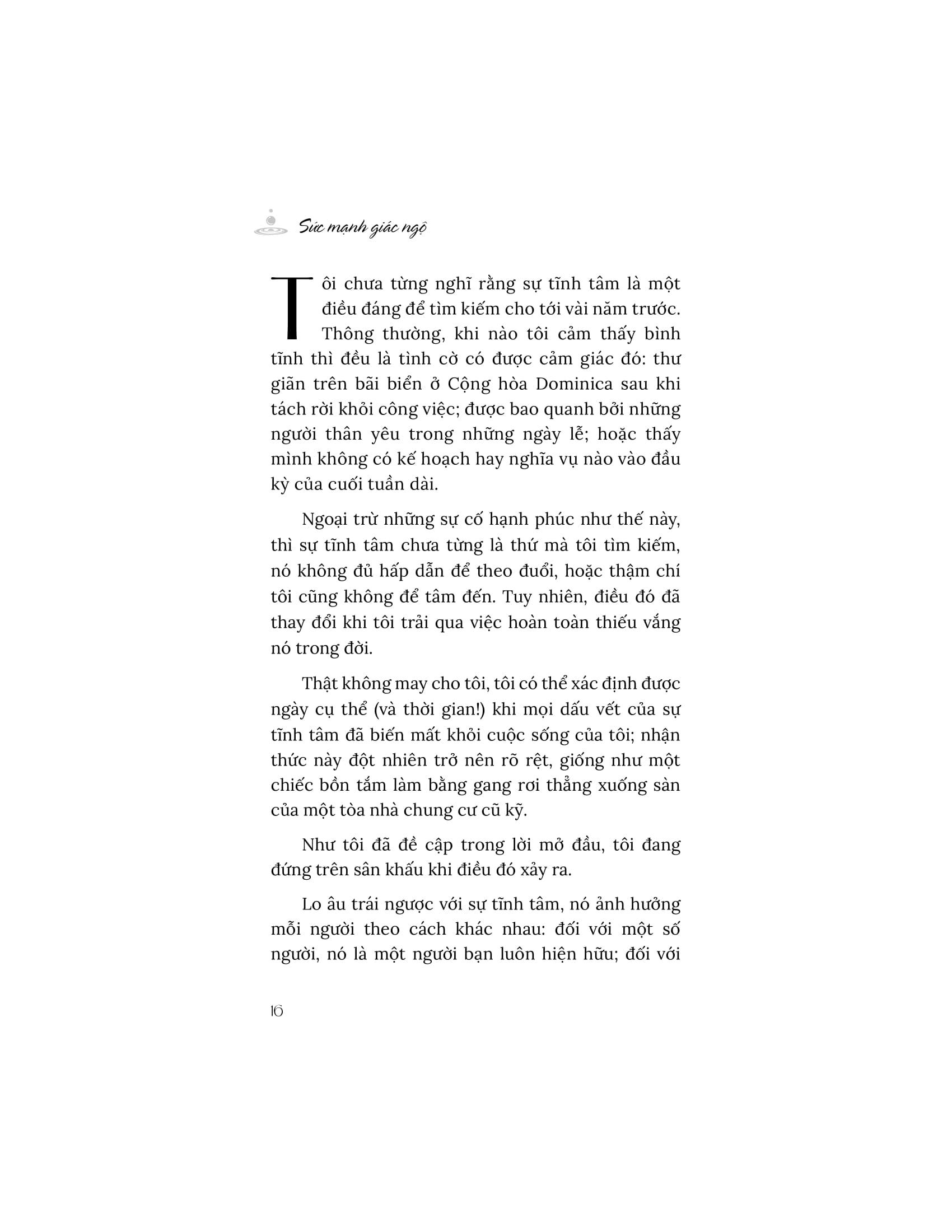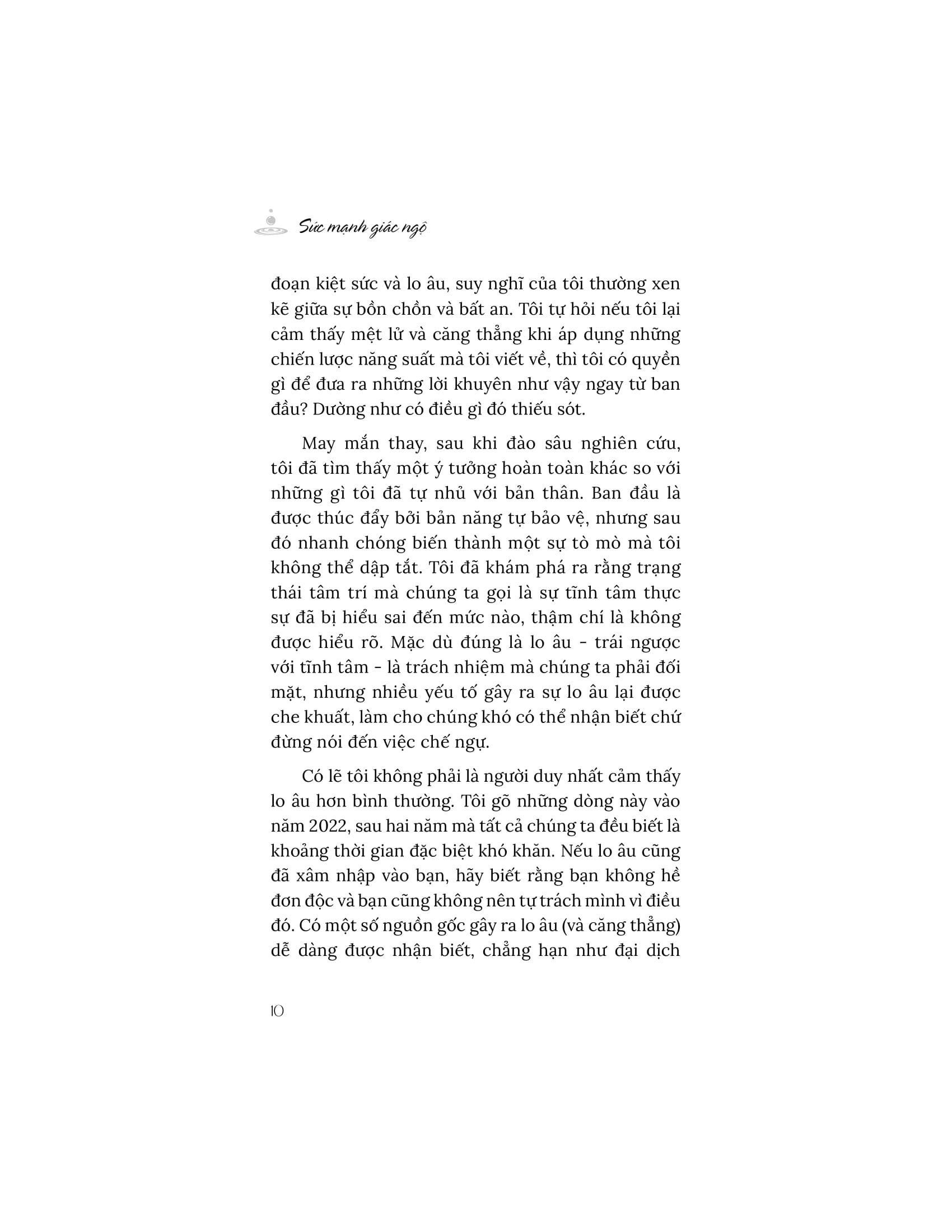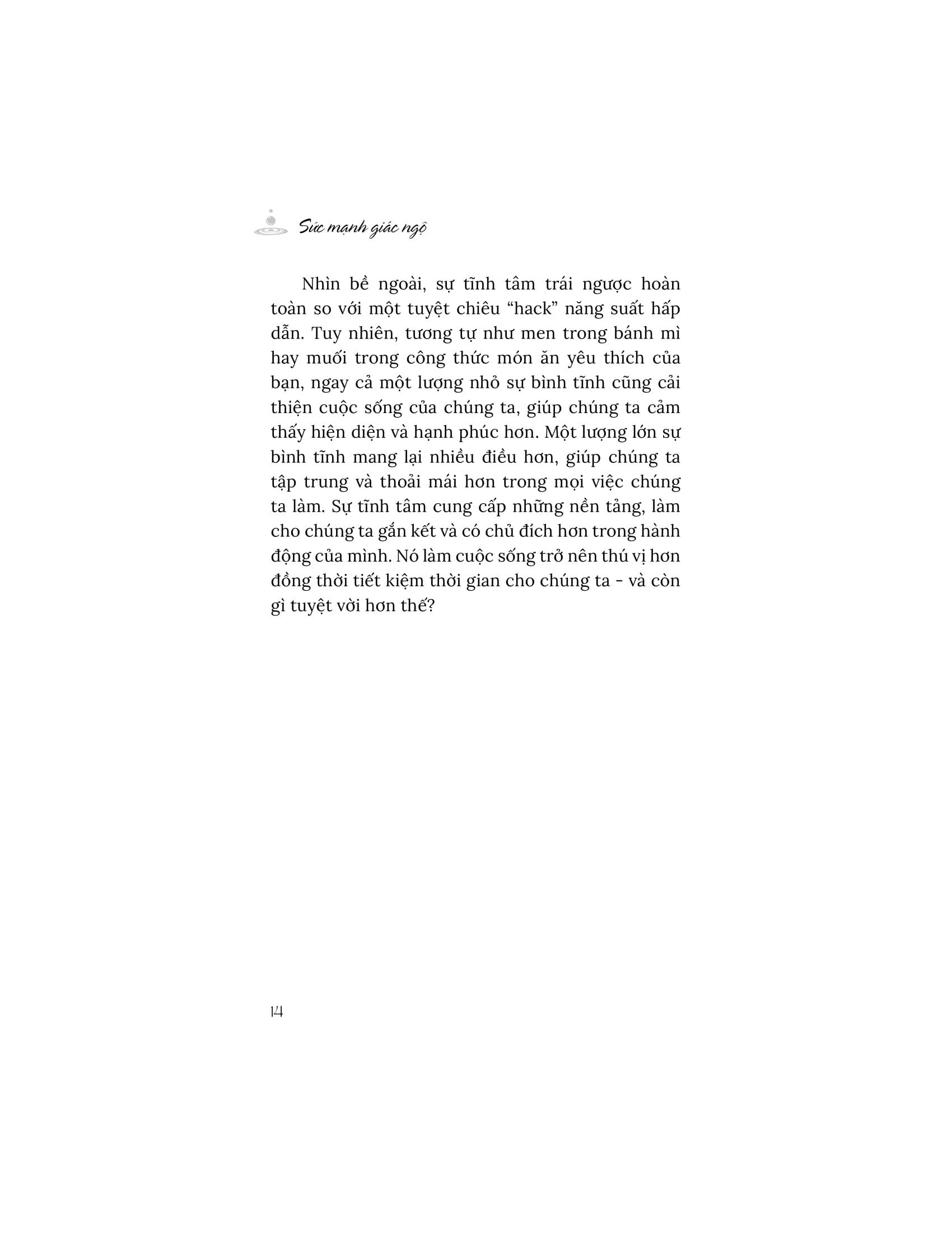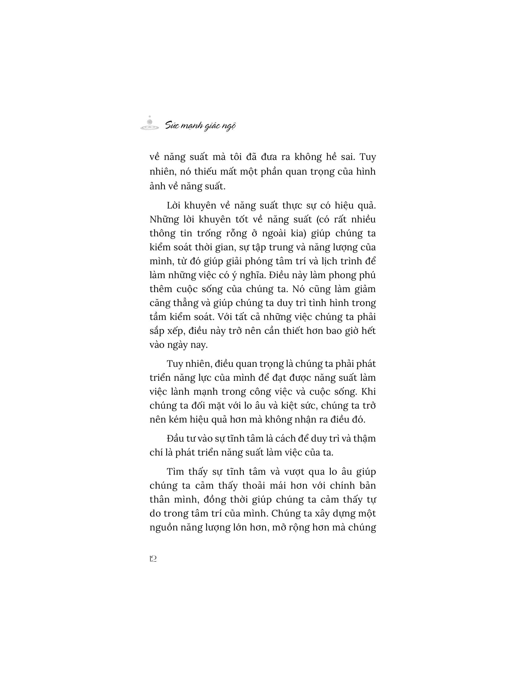 Khi đối mặt với lo âu và kiệt sức, chúng ta trở nên kém hiệu suất hơn mà không nhận ra điều đó. Cuốn sách “Sức mạnh giác ngộ” giúp chúng ta hiểu rằng, đầu tư vào sự tĩnh tâm là cách để duy trì và thậm chí là phát triển năng suất làm việc của m.ình. Tìm thấy sự tĩnh tâm và vượt qua lo âu giúp chúng ta cảm thấy thoải mái hơn với chính bản thân và tự do trong tâm trí của m.ình. Sự tĩnh tâm chính là một nguồn năng lượng cốt lõi của những gì làm cho cuộc sống trở nên thú vị. Từ đó sinh ra năng suất, sự hiện diện, sáng suốt, ý định, nhận thức, sự thoải mái, khiếu hài hước, sự công nhận, sự sáng tạo và lòng biết ơn.