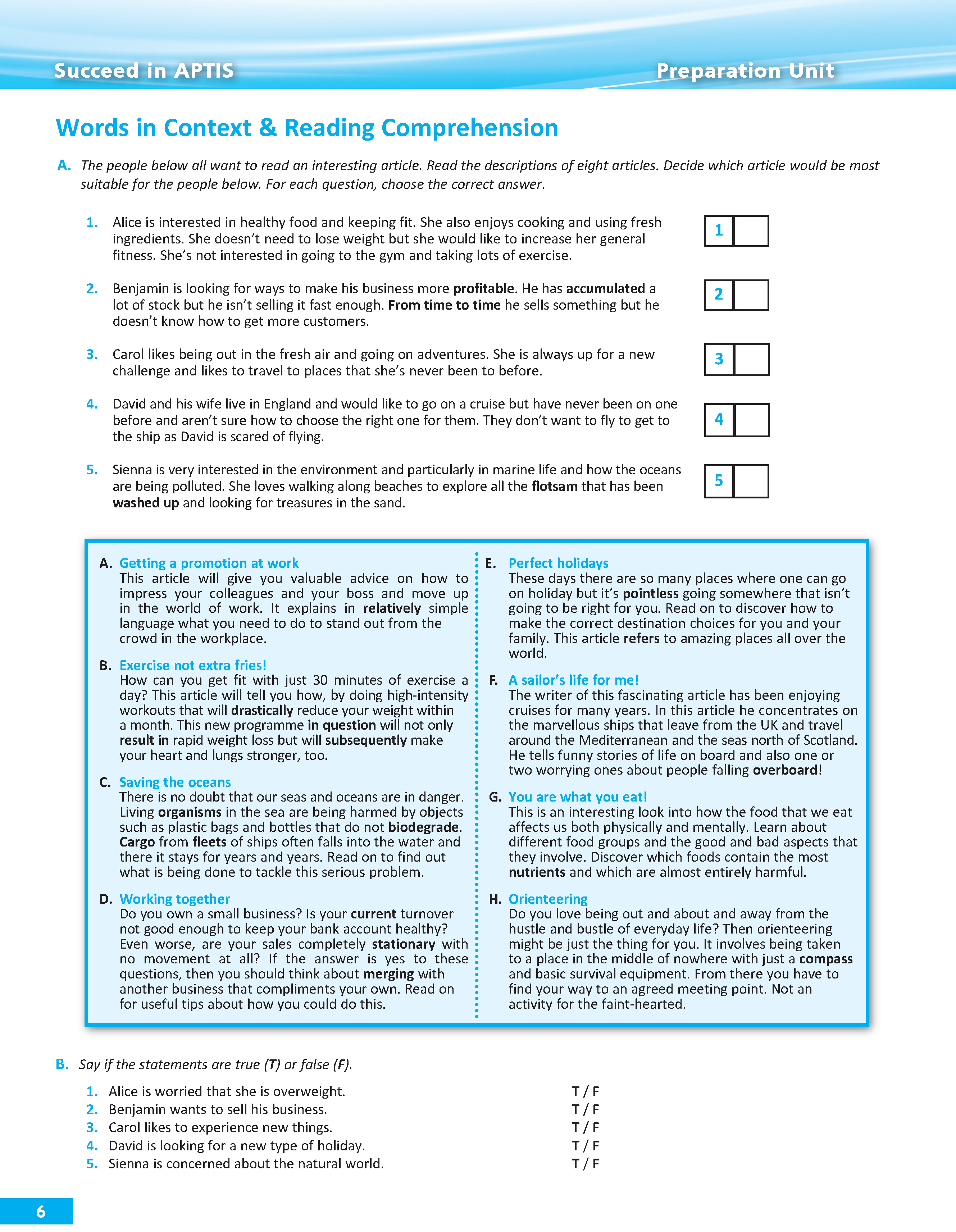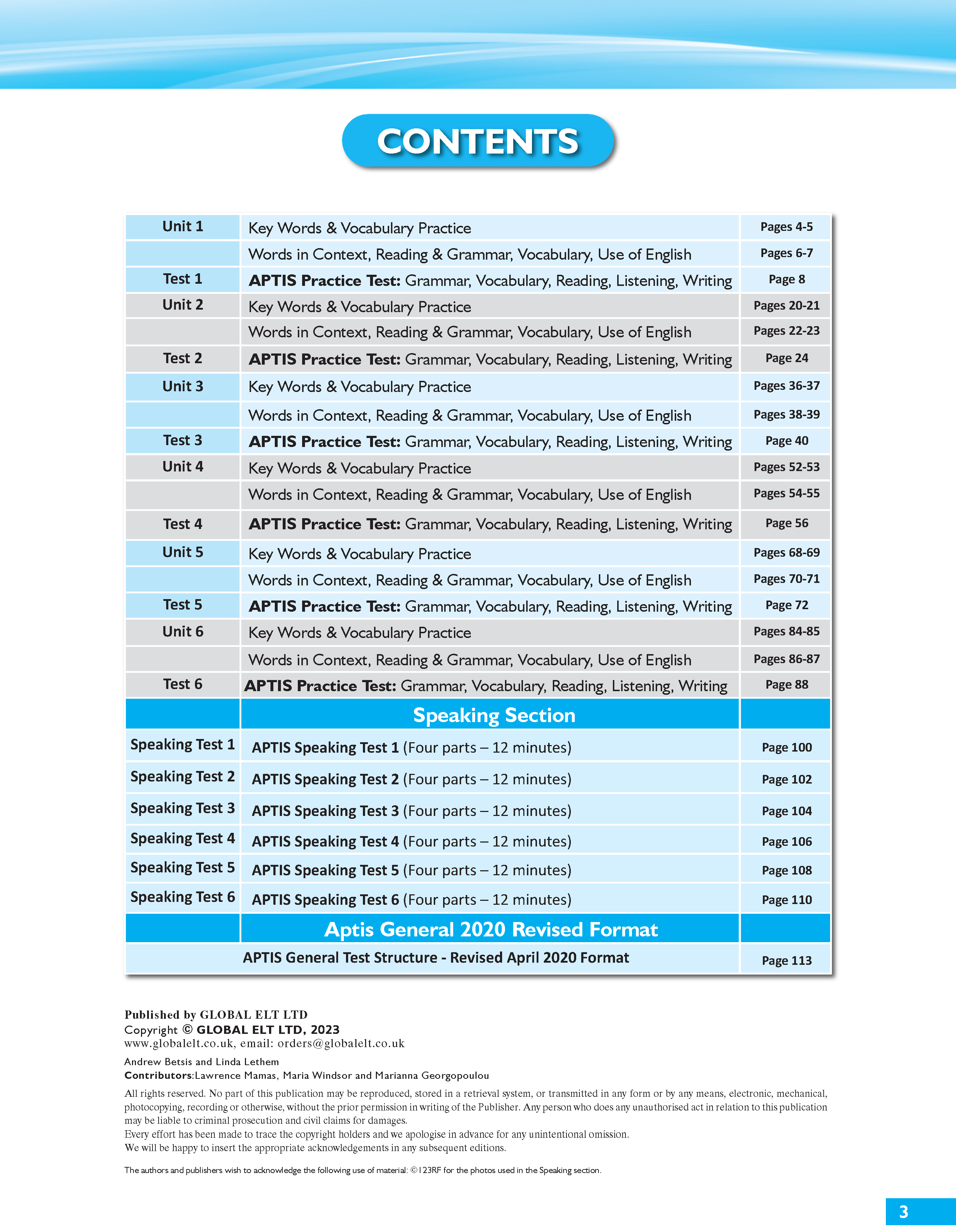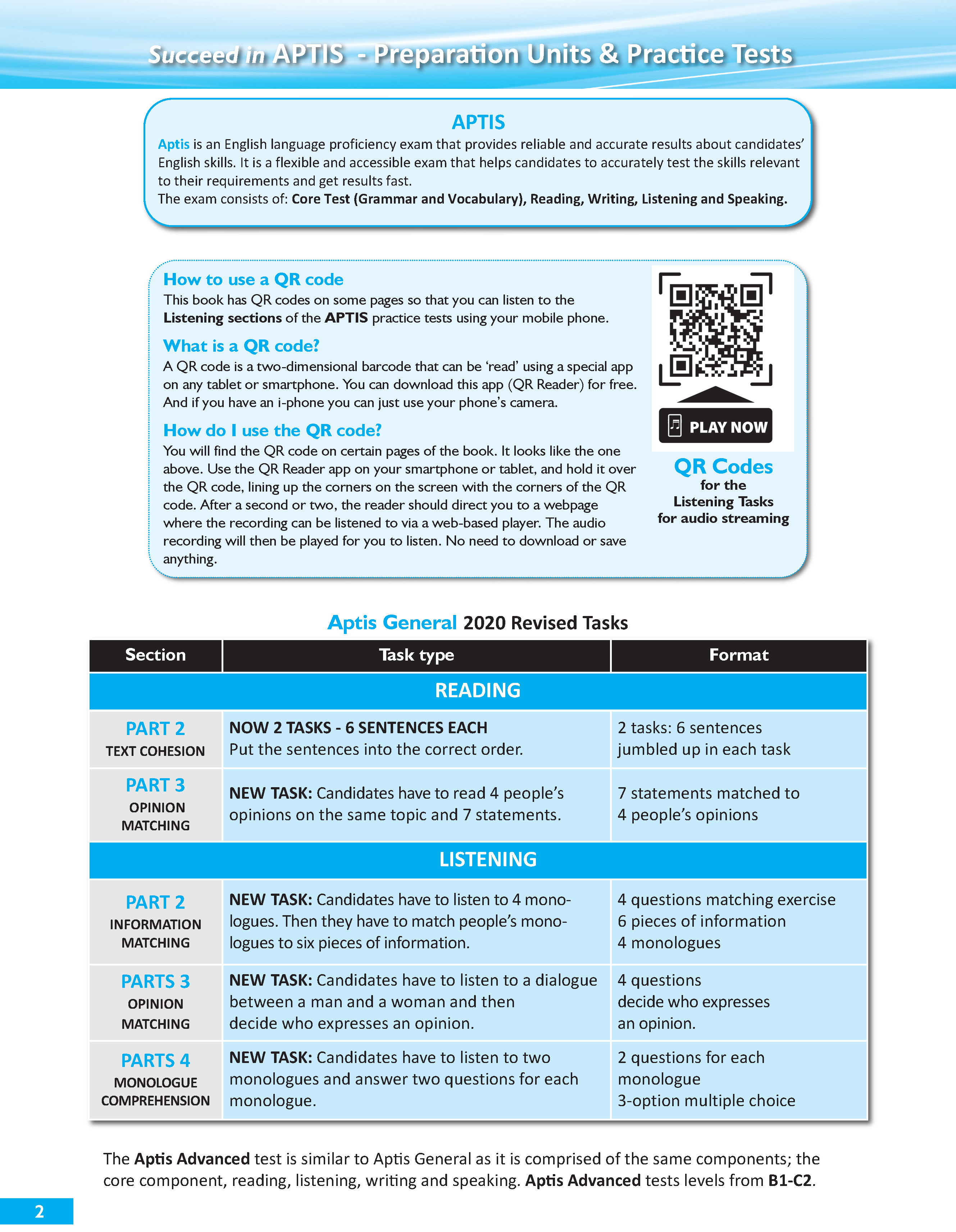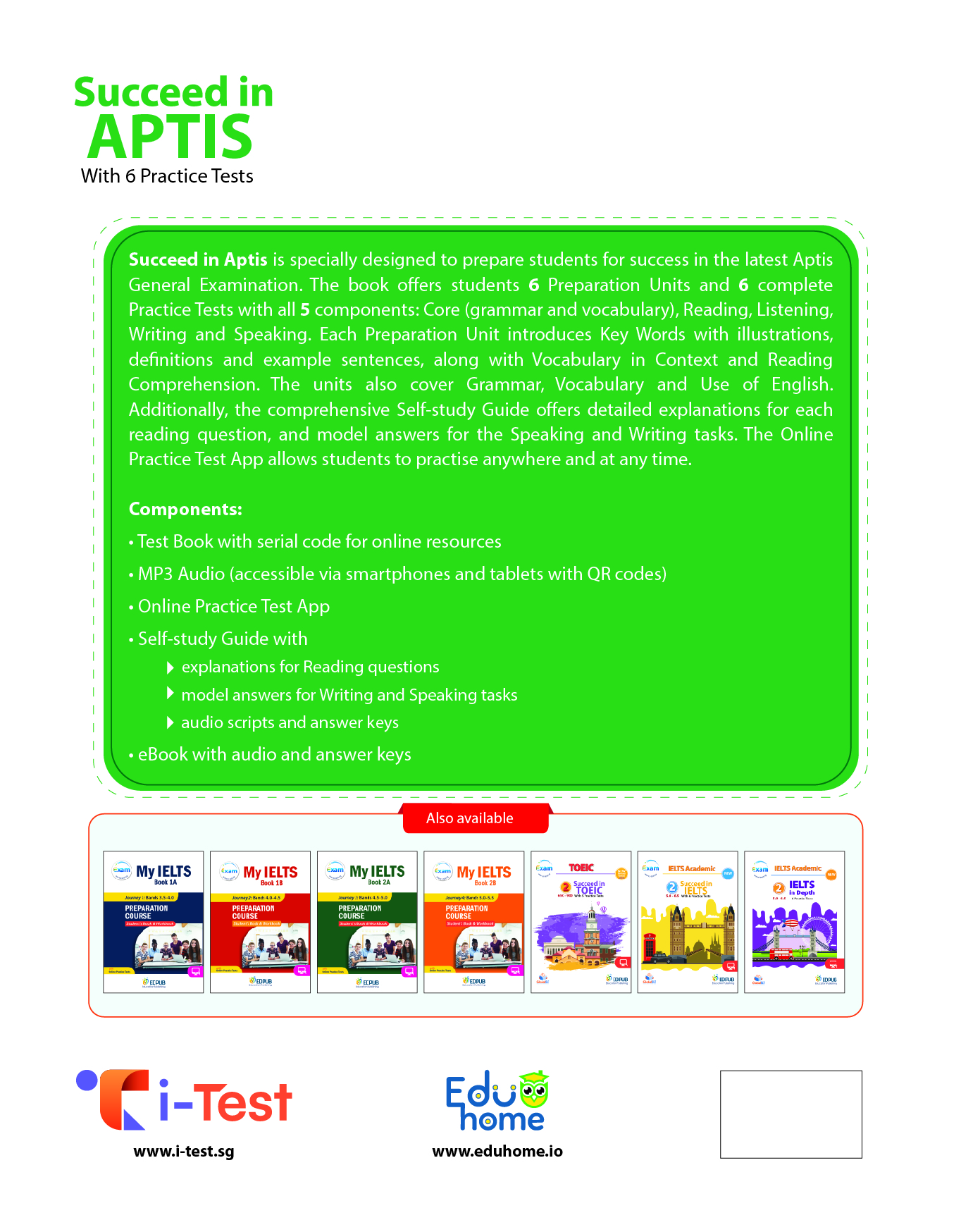Succeed in Aptis is specially designed to prepare students for success in the latest Aptis General Examination. The book offers students 6 Preparation Units and 6 complete Practice Tests with all 5 components: Core (grammar