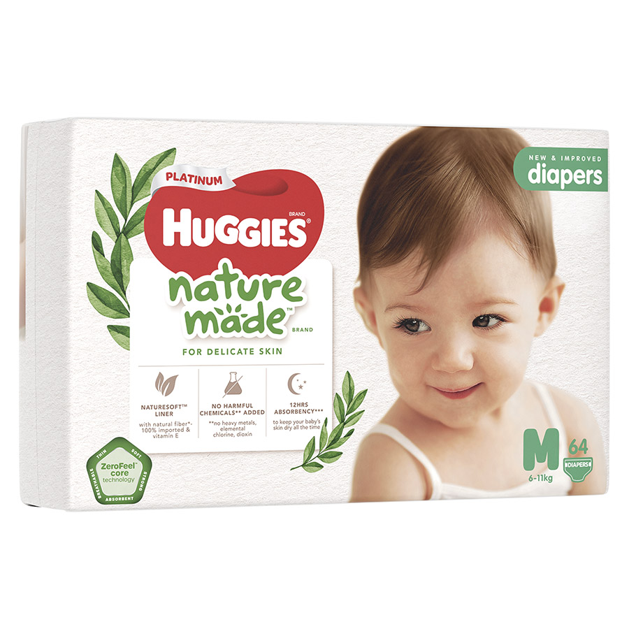 - Tã dán cao cấp Huggies Platinum Nature Made size M (6-11kg): 58 miếng hoặc 64 miếng/túi