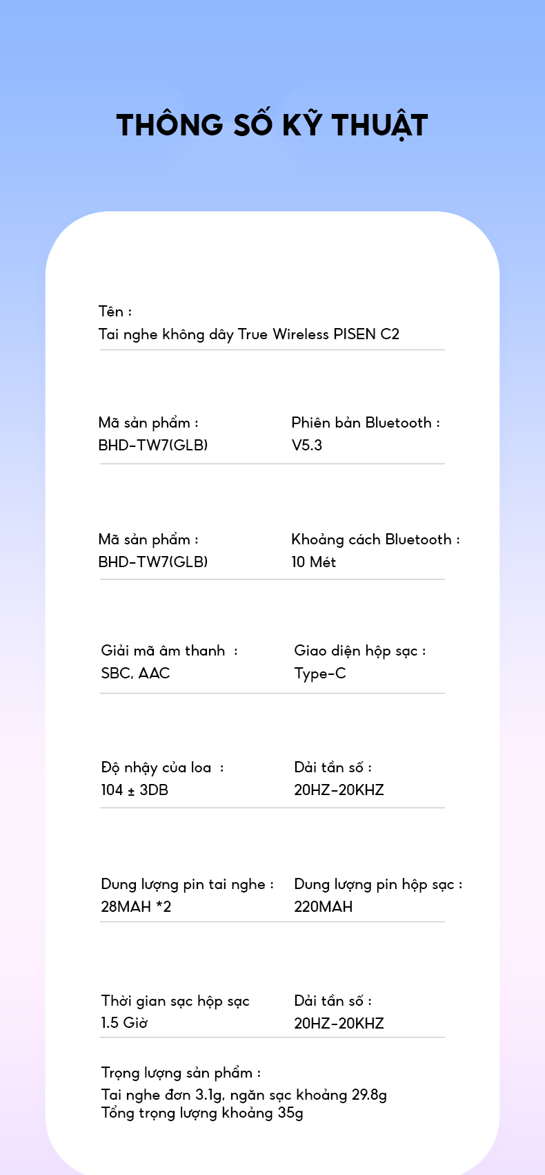 Shop Small có năm bảy loại, có shop họ vẫn trộn đồ giả vào ( họ trình giấy tờ xin lên small thương hiệu A, nhưng đăng bán thương hiệu B khác được ( sản phẩm giả kém chất lượng). Mình đã thấy rất nhiều shop như vậy Hình ảnh cũng lấy tràn ngập , hoá đơn giả, chứng từ giả tràn lan, nên bạn hãy cảm nhận kỹ trước khi mua nhé. -------------------------------------------------------------- Tai nghe Bluetooth PISEN C2 ANC ENC True wireless ( Màu trắng) - Hàng chính hãng, bảo hành 18 tháng Nâng cấp lớn về thính giác - Nhỏ và nhẹ trên tai Thiết kế hộp nắp gập : dễ dàng lấy và cất, phong cách mới lạ Tuổi thọ pin dài : đi cùng bạn từ sáng tới tối Micro hd : cuộc gọi rõ ràng và không tiếng ồn Cuộn dây lớn 10mm : chất lượng âm thanh trong suốt và tự nhiên Tai nghe chỉ 3.1g : trải nghiệm đeo siêu nhẹ Ipx4 chống thấm nước : không sợ mồ hôi và mưa Công nghệ bluetooth 5.3 : kết nối nhanh chóng không chờ đợi Thiết kế buồng cửa mở Bật nhẹ để bắt đầu hành trình âm nhạc Ngăn sạc bán mở kiểu buồng lái sáng tạo của pisen, âm nhạc sẽ nhẩy múa xung quanh bạn ngay khi mở nắp Từ tính siêu mạnh – lấy và cất mượt – cảm giác mượt mà Nhẹ nhàng và dễ chịu Không cảm giác, thoải mái hơn khi đeo Thiết kế gọn nhẹ, tự nhiên và vừa vặn với vành tai, đeo như không đeo (ý nó nói là nhẹ, không gây khó chịu) 3.1g giải phóng áp lực ở cả 2 tai Rẻ mà hay Chất lượng âm thanh hifi, sóng âm dâng trào, như đang ở hiện trường Cuộn dây động kích thước lớn 10mm và màng ngăn polymer Giảm tiếng ồn cuộc gọi enc Tránh xa tiếng ồn, giao tiếp thoải mái Tích hợp micro hd, nhận chính xác giọng nói, bất kể tiếng ồn của gió hay tầu điện ngầm, các cuộc gọi đều có độ phân giải cao luôn lọc bỏ tiếng ồn Chống ồn chủ động ANC Tận hưởng âm nhạc và trò chuyện với bạn bè thoải mái ngay cả khi trong môi trường ồn ào Thời lượng pin 25h Luôn sẵn sàng cho cả ngày Được trang bị ngăn chứa pin, toàn thời lượng pin là 25h, du lịch / đi lại / tập thể dục, tạm biệt nỗi lo về pin *Dữ liệu từ pisen lab và chỉ mang tính tham khảo, thực tế có thể khác do môi trường và cách sử dụng Tai nghe tốt luôn hiểu ý bạn Điều khiển mượt chỉ bằng một cú chạm Chạm vào vùng cảm ứng, điều khiển tai nghe, trả lời cuộc gọi và tùy chỉnh nhạc, thiết kế tiện lợi
