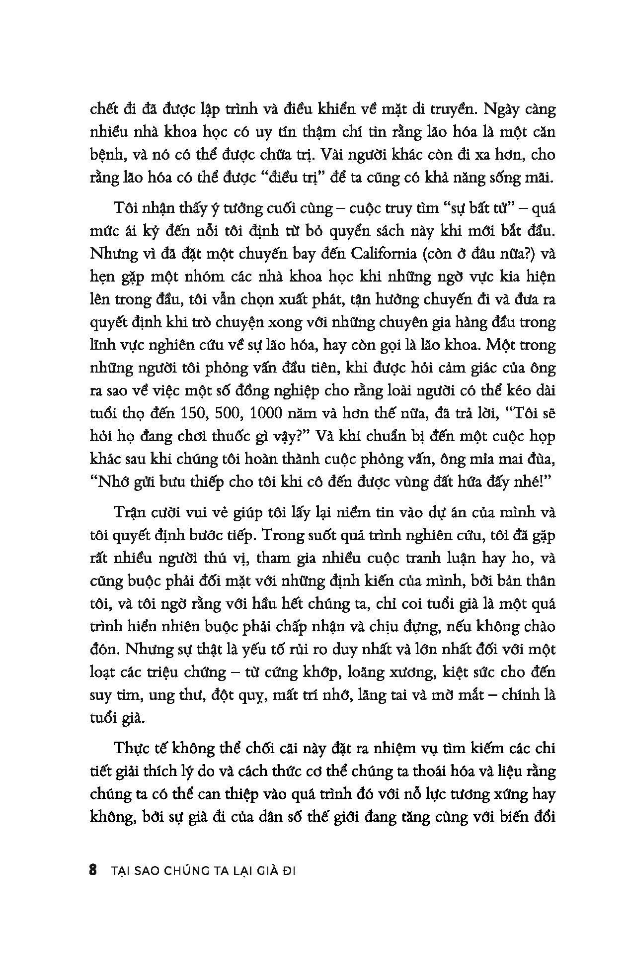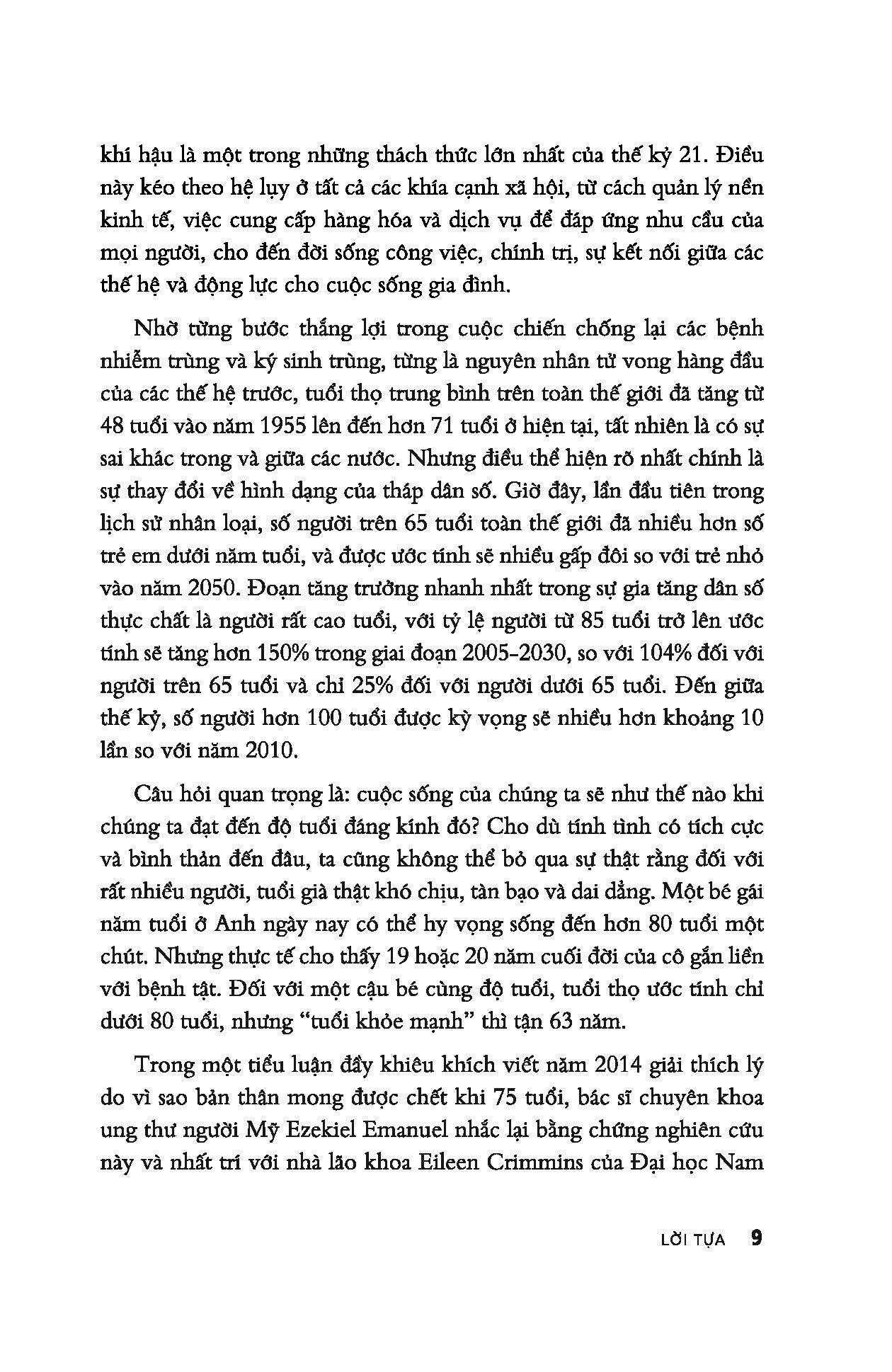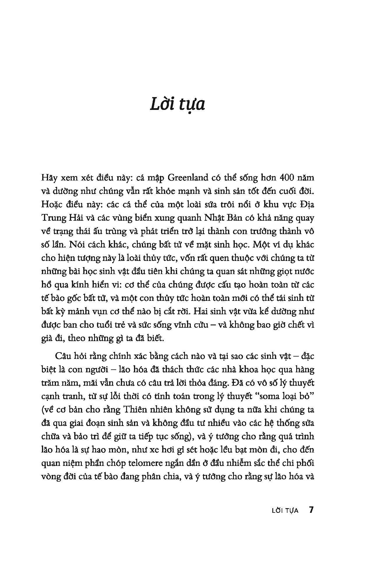 Lão hóa là vấn đề mà tất cả chúng ta đều quan tâm, tuy nhiên chưa có sự đồng thuận và thống nhất giữa các nhà khoa học về nguyên nhân và cơ chế của quá trình này. Có người thì cho rằng đó là quá trình hao mòn cơ bản, người thì tin rằng đây là quy luật được lập trình sẵn để kiểm soát về mặt di truyền, thậm chí có người tin rằng lão hóa là bệnh, có thể được đều ị nhằm kéo dài tuổi thọ đến vô tận… Trong cuốn sách này, Sue Armstrong sẽ kể câu chuyện về quá trình tìm hiểu sự lão hóa; trình bày các nghiên cứu, phát kiến mới nhất của khoa học về quá trình này.