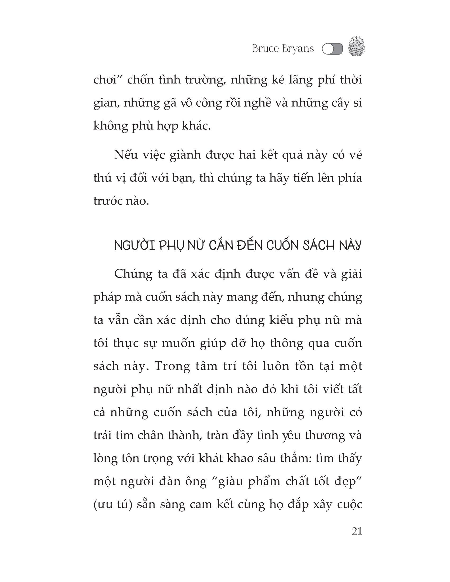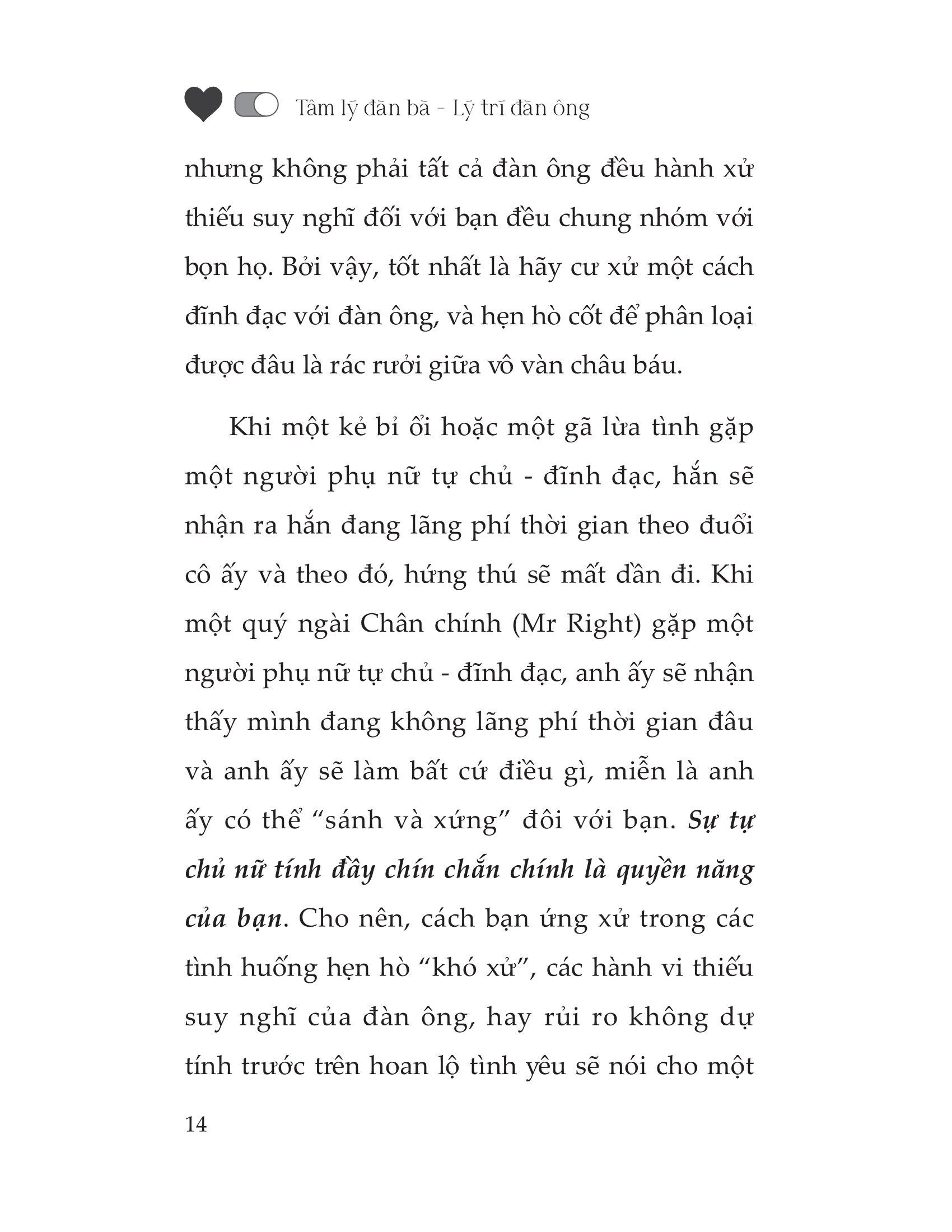 Khi nói đến việc tìm kiếm một người bạn đời phù hợp cho một mối quan hệ nghiêm túc và cam kết, một trong những điều đàn ông mong muốn nhất ở phụ nữ là sự tự chủ, hay nói cách khác là sự đĩnh đạc của phụ nữ. Sự tự chủ ấy sẽ làm tăng giá trị bản thân của người phụ nữ lên gấp nhiều lần. Trong tình yêu, những người phụ nữ ấy luôn biết duy trì sự bí ẩn, sự quyến rũ nữ tính của m.ình để mời gọi đàn ông theo đuổi cô ấy say đắm. Người ta thường nói rằng: “Phụ nữ yêu bằng tai, đàn ông yêu bằng mắt.” Nếu bạn muốn thu hút và duy trì sự chú ý của một người đàn ông có phẩm chất cao - một người có hoãi bão, cam kết một mối quan hệ lâu dài, hay chỉ đơn giản là muốn biết rõ điều m.ình muốn về người ấy,… thì cuốn sách này là dành cho bạn.