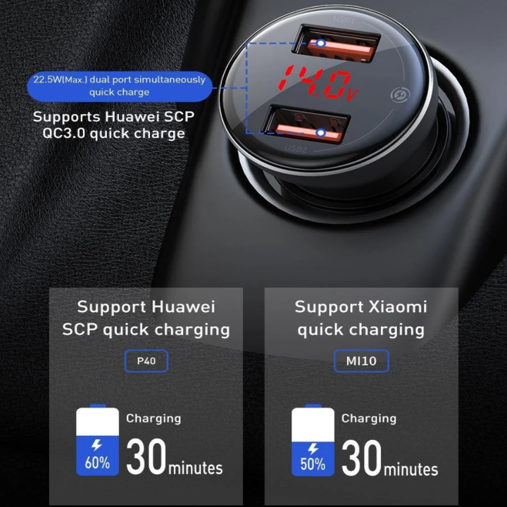 Tẩu Sạc Xe Ô Tô Có Màn Hình Led Hiển Thị - Công dụng: hai cổng sạc USB có thể sạc 2 thiết bị cùng 1 lúc, hỗ trợ tất cả thiết bị đầu