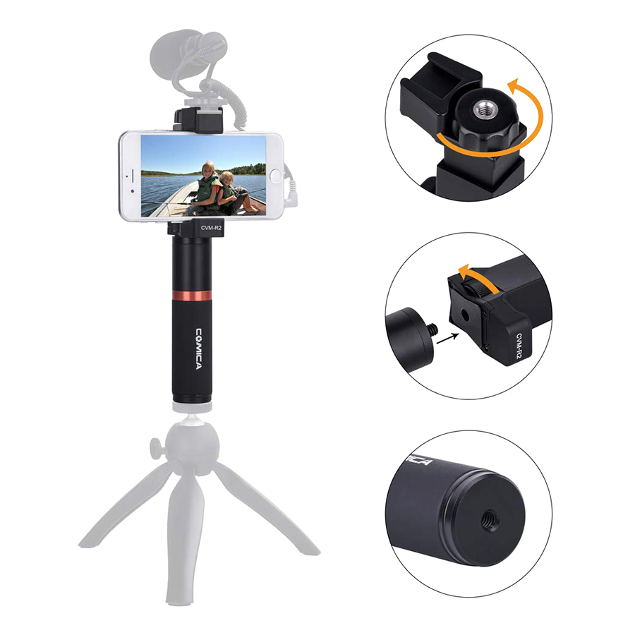 - Tay Cầm Chụp Hình cho điện thoại Comica CVM-R2 có thiết kế chắc chắn, có trọng lượng đã được tính toán để tạo sự ổn định cho khung hình khi cầm máy chỉ với