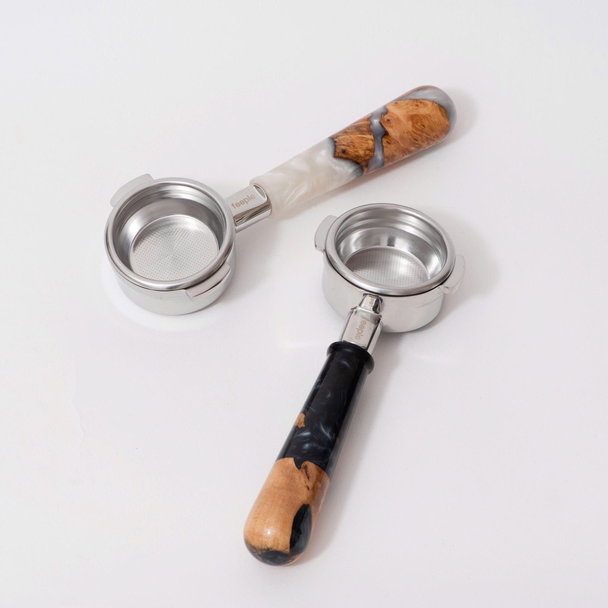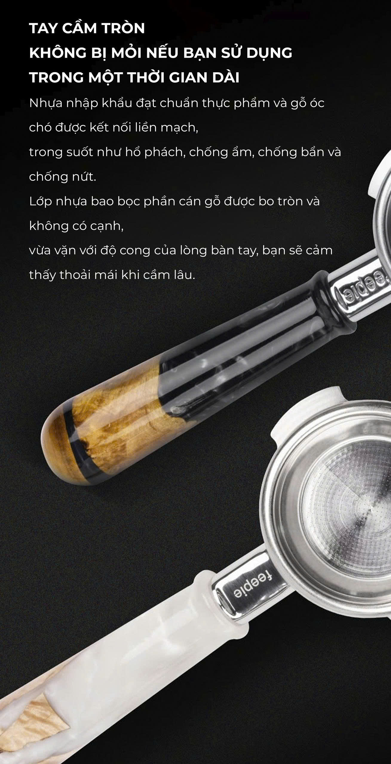 TAY CẦM ESPRESSO KHÔNG ĐÁY VÂN GỖ TỰ NHIÊN FEEPIE Sự kết hợp tuyệt vời giữa gỗ óc chó và nhựa cao cấp mang đến cho bạn trải nghiệm pha chế espresso đẳng cấp. Tay