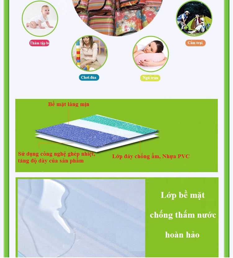 Thảm có một mặt được tráng nhựa bạt giúp chống thấm nước, phù hợp dùng trong sinh hoạt ngoài trời khi đi picnic, dã ngoại.
