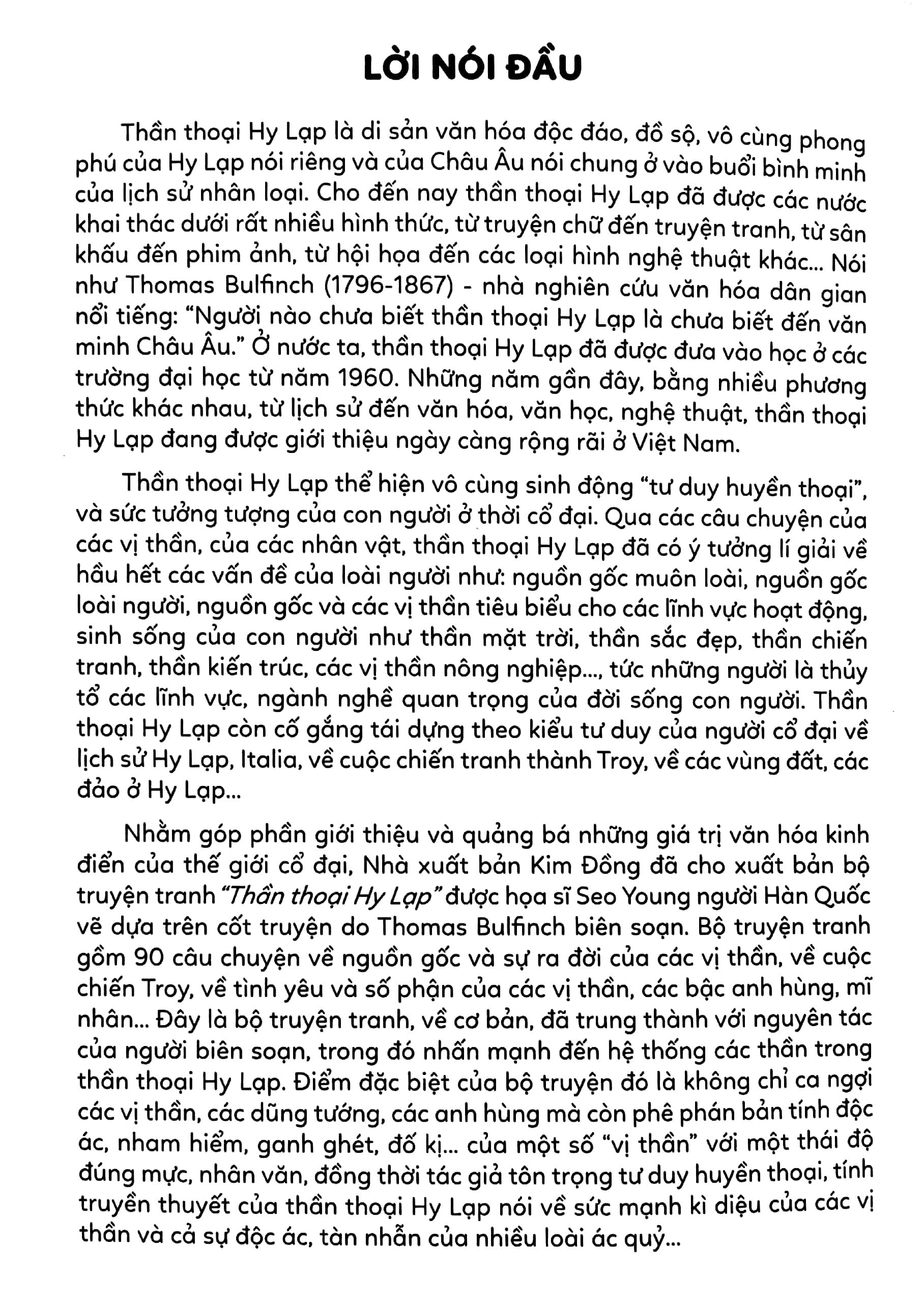 Thần thoại Hy Lạp là những câu chuyện vô cùng cảm động, kì thú về thế giới các vị thần có thể hô phong hoán vũ; về các nàng tiên rừng, tiên sông, tiên biển xinh đẹp, yêu kiều; về các dũng sĩ, anh hùng gan dạ, lừng lẫy tiếng tăm; về các nhà vua, hoàng hậu, công chúa, hoàng tử số phận bi ai; về các loài quái vật gớm ghiếc, những tên khổng lồ đáng sợ đã trở thành nguồn cội của văn hóa phương Tây và của cả thế giới khiến bao thế hệ say mê tìm đọc.