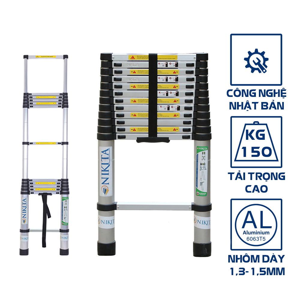 Thang nhôm rút gọn, an toàn, tiện dụng, đa năng - Nhôm 6063 không rỉ - Hàng chính hãng NIKITA Chất liệu : Nhôm + Plastic Màu sắc : Ống trắng + Đai nhựa