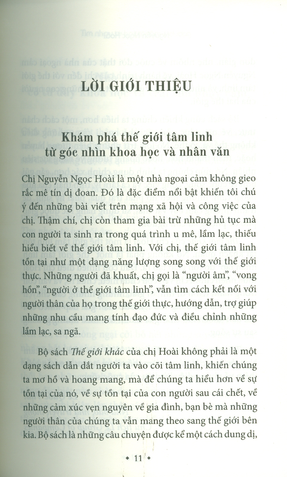 "Thế giới khác 2: Tìm nhau từ hai cõi âm – dương" là những minh chứng tiếp theo cho sự tồn tại của một thế giới tâm linh hiện diện qua từng con chữ. Thế giới tâm linh tồn tại. Thế giới ấy không phải là sự huyễn hoặc của tâm tưởng và niềm tin một chiều của con người, hay qua sự thêu dệt của dân gian, hay chỉ là lớp áo dày và trang trọng khoác bên ngoài các lễ nghi, tập tục như một văn hóa lâu đời của con người, bất chấp niềm tin và tư tưởng ngược chiều của con người vào vô thần và hữu thần. Tác giả – nhà ngoại cảm Nguyễn Ngọc Hoài chính là người ghi chép lại tất cả những hiểu biết về thế giới giới tâm linh đã và đang phủ bóng lên đời mình, trung thực lưu lại kiến thức và trải nghiệm trong gần một phần tư thế kỷ sở hữu năng lực tâm linh, thực hành công việc tiếp xúc với vong hồn và tìm mộ liệt sĩ trong vai trò nhà ngoại cảm công tác trong các cơ quan nghiên cứu về tiềm năng con người của Việt Nam.