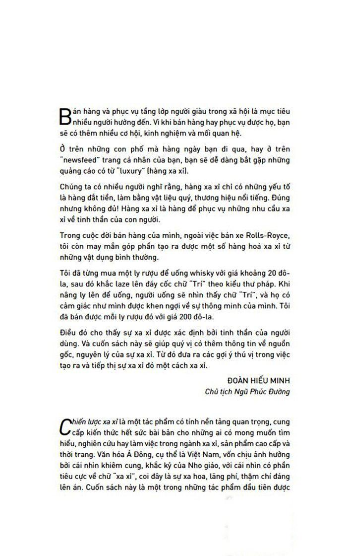 Dựa trên phân tích về các chức năng xã hội của hàng xa xỉ, các phương pháp hay nhất trên toàn thế giới (ngoài các lĩnh vực hàng xa xỉ truyền thống) và kinh nghiệm trực tiếp, nó đặt ra các quy tắc hạn chế và thường là nghịch lý để thành công, chẳng hạn như đảo ngược các quy tắc tiếp thị vốn có. Cuốn sách sẽ: