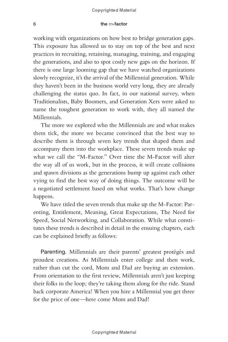 The M-Factor: How the Millennial Generation Is Rocking the Workplace From Lynne C. Lancaster and David Stillman, the nationally recognized generational experts and authors of When Generations Collide, comes the definitive guide to “Millennials” (those born